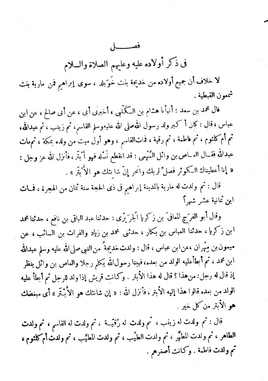 قَالَ: ثُمَّ وَلَدَتْ لَهُ مَارِيَةُ بِالْمَدِينَةِ إِبْرَاهِيمَ فِي ذِي الْحِجَّةِ سَنَةَ ثَمَانٍ مِنَ الْهِجْرَةِ، فَمَاتَ ابْنَ ثَمَانِيَةَ عَشَرَ شَهْرًا وَقَالَ أَبُو الْفَرَجِ الْمُعَافَى بْنُ زَكَرِيَّا الْجَرِيرِيُّ: حَدثنَا عبد الْبَاقِي بن نَافِع، حَدثنَا مُحَمَّد ابْن زَكَرِيَّا، حَدثنَا الْعَبَّاسُ بْنُ بَكَّارٍ، حَدَّثَنِي مُحَمَّدُ بْنُ زِيَادٍ وَالْفُرَاتُ بْنُ السَّائِبِ، عَنْ مَيْمُونٍ بْنِ مِهْرَانَ، عَنِ ابْنِ عَبَّاسٍ، قَالَ: وَلَدَتْ خَدِيجَةُ مِنَ النَّبِيِّ صَلَّى اللَّهُ عَلَيْهِ وَسَلَّمَ عَبْدُ اللَّهِ ابْن مُحَمَّدٍ، ثُمَّ أَبْطَأَ عَلَيْهِ الْوَلَدُ مِنْ بَعْدِهِ، فَبَيْنَا رَسُولُ اللَّهِ يُكَلِّمُ رَجُلًا وَالْعَاصُ بْنُ وَائِل ينظر إِذْ قَالَ لَهُ رَجُلٌ: مَنْ هَذَا؟ قَالَ لَهُ هَذَا الْأَبْتَرُ.