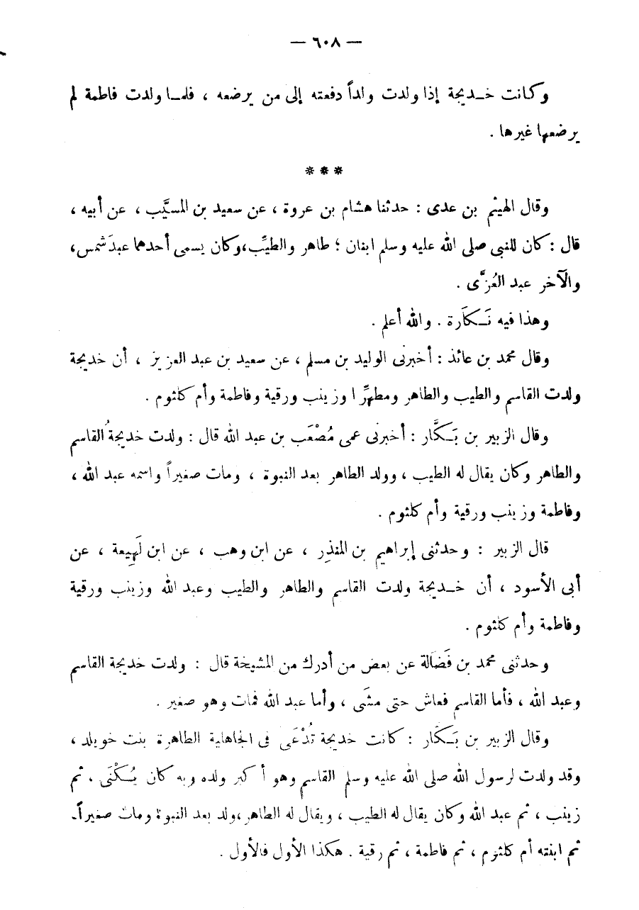 وَقَالَ الزُّبَيْرُ بْنُ بَكَّارٍ: أَخْبَرَنِي عَمِّي مُصْعَبُ بْنُ عَبْدِ اللَّهِ قَالَ: وَلَدَتْ خَدِيجَةُ الْقَاسِمَ وَالطَّاهِرَ وَكَانَ يُقَالُ لَهُ الطَّيِّبُ، وَوُلِدَ الطَّاهِرُ بَعْدَ النُّبُوَّةِ، وَمَاتَ صَغِيرًا وَاسْمُهُ عَبْدُ اللَّهِ، وَفَاطِمَة وَزَيْنَب ورقية وَأم كُلْثُوم.