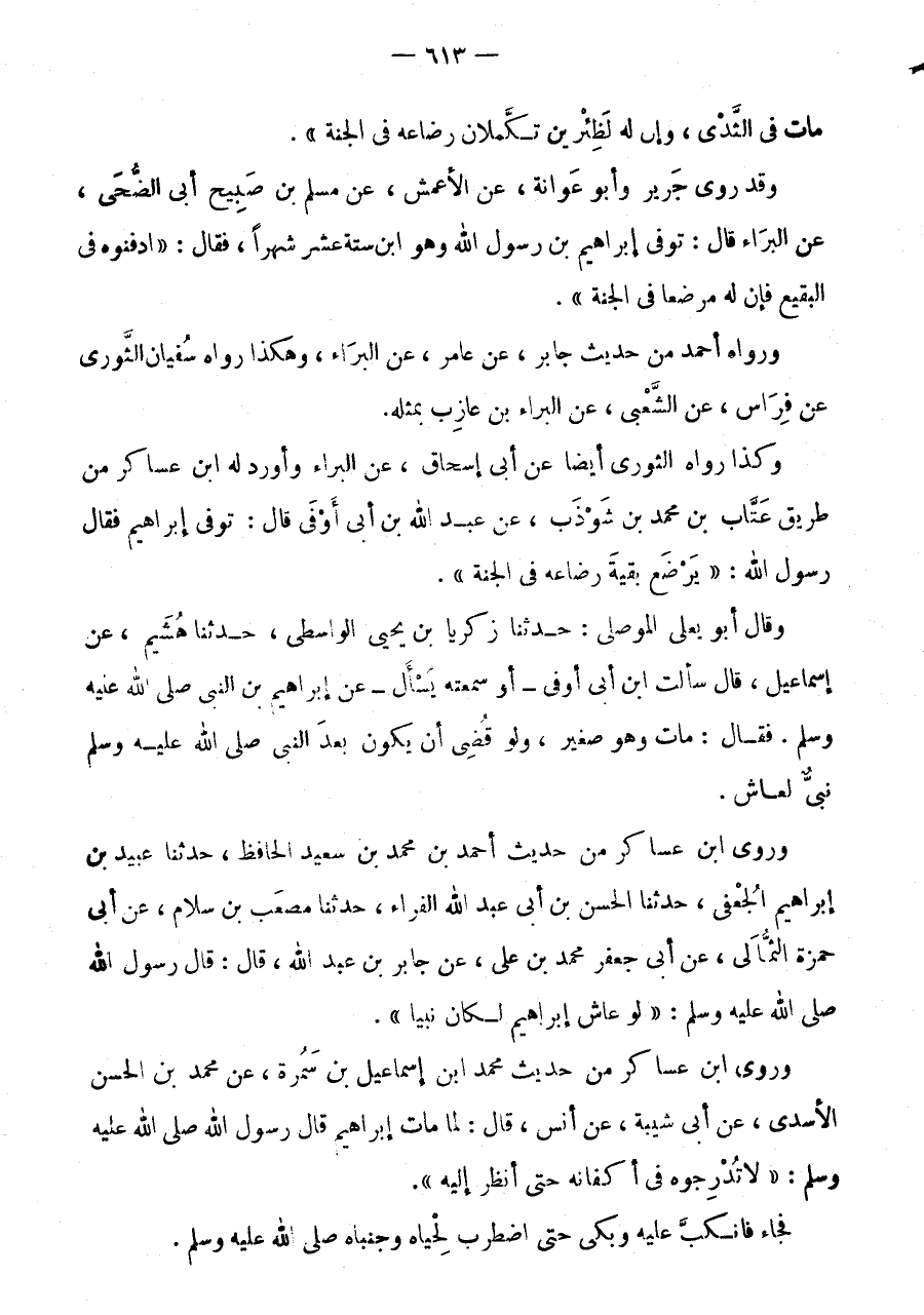 وَكَذَا رَوَاهُ الثَّوْرِيُّ أَيْضًا عَنْ أَبِي إِسْحَاق، عَن الْبَراء وَأورد لَهُ ابْنُ عَسَاكِرَ مِنْ طَرِيقِ عَتَّابِ بْنِ مُحَمَّدِ بْنِ شَوْذَبٍ، عَنْ عَبْدِ اللَّهِ بْنِ أَبِي أَوْفَى قَالَ: توفى إِبْرَاهِيم فَقَالَ رَسُول الله: " يَرْضَعُ بَقِيَّةَ رَضَاعِهِ فِي الْجَنَّةِ ".