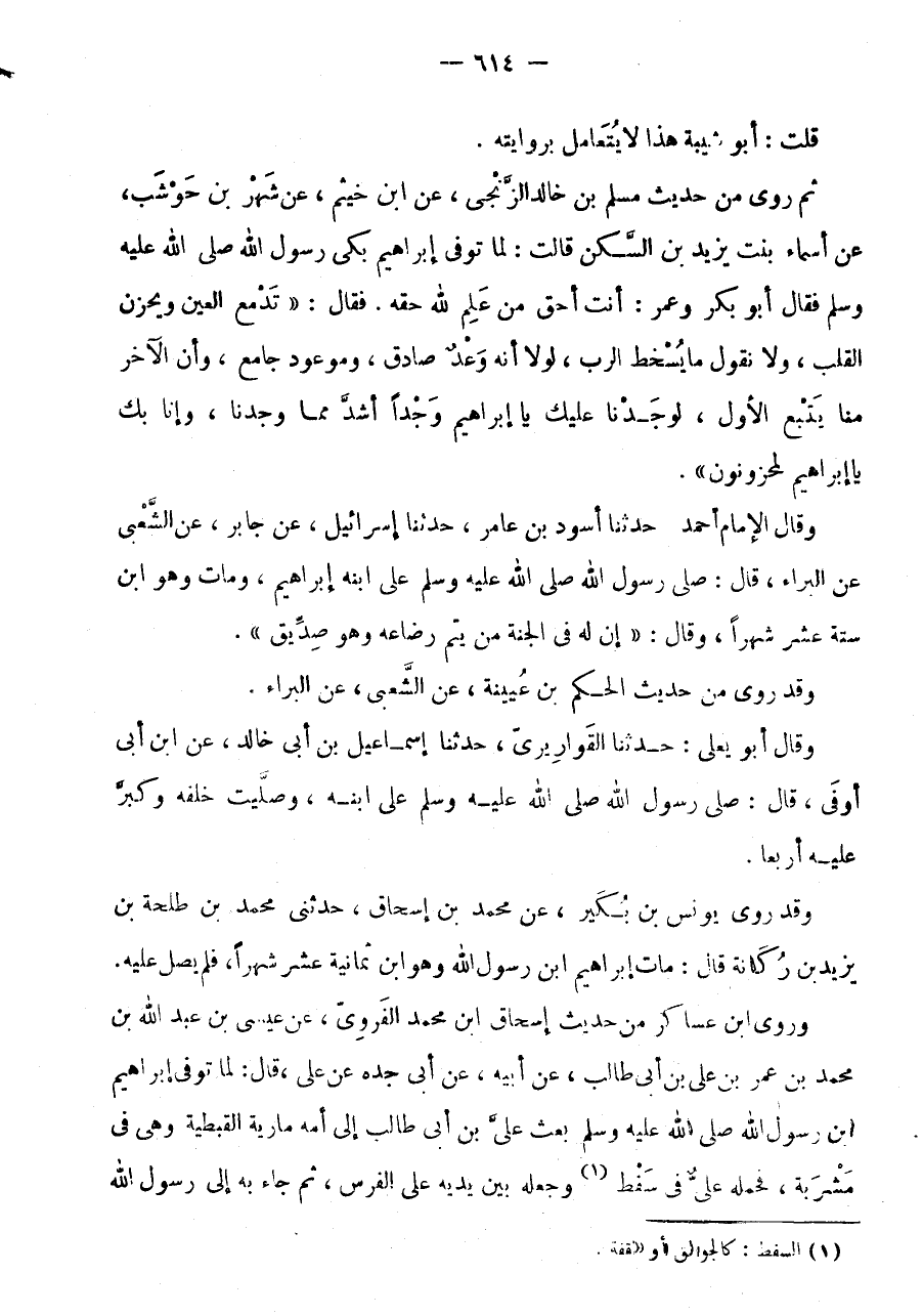 ثُمَّ رَوَى مِنْ حَدِيثِ مُسْلِمِ بْنِ خَالِدٍ الزنْجِي، عَن ابْن خَيْثَم، عَنْ شَهْرِ بْنِ حَوْشَبٍ، عَنْ أَسْمَاءَ بِنْتِ يَزِيدَ بْنِ السَّكَنِ قَالَتْ: لَمَّا تُوُفِّيَ إِبْرَاهِيمُ بَكَى رَسُولُ اللَّهِ صَلَّى اللَّهُ عَلَيْهِ وَسَلَّمَ فَقَالَ أَبُو بَكْرٍ وَعُمَرُ: أَنْتَ أَحَقُّ مَنْ علم لله حَقه.