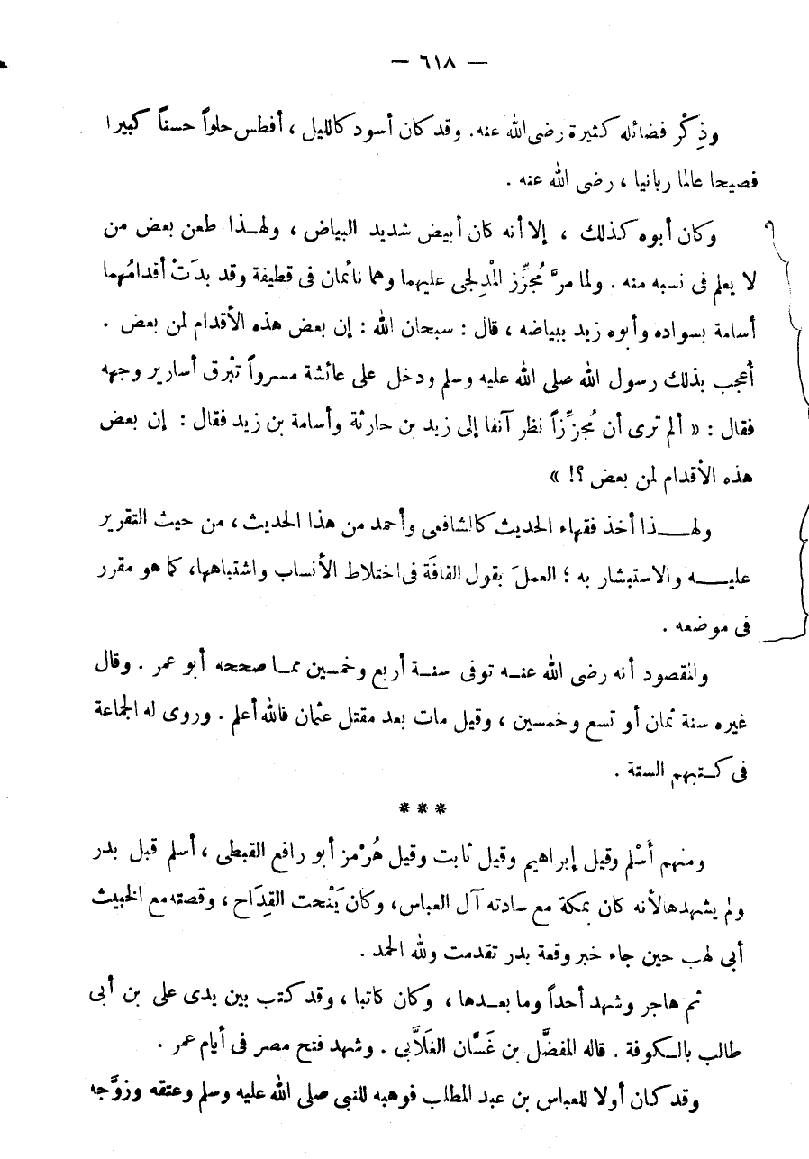 وَلَمَّا مَرَّ مُجَزِّزٌ الْمُدْلِجِيُّ عَلَيْهِمَا وَهُمَا نَائِمَانِ فِي قَطِيفَةٍ وَقَدْ بَدَتْ أَقْدَامُهُمَا أُسَامَةُ بِسَوَادِهِ وَأَبُوهُ زَيْدٌ بِبَيَاضِهِ، قَالَ: سُبْحَانَ اللَّهِ: إِنَّ بَعْضَ هَذِهِ الْأَقْدَامِ لَمِنْ بَعْضٍ.