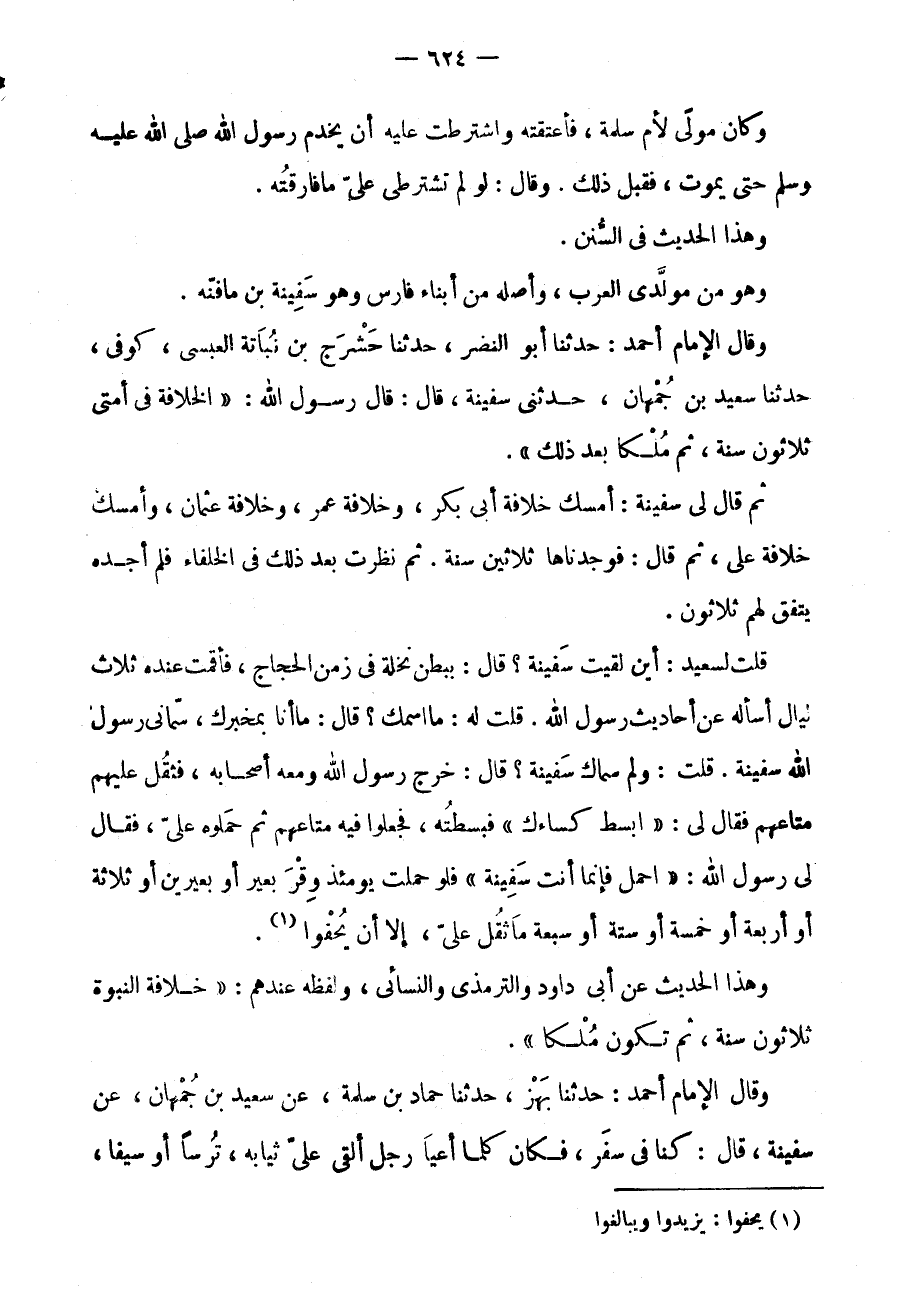 وَهَذَا الحَدِيث عَن أَبِي دَاوُدَ وَالتِّرْمِذِيِّ وَالنَّسَائِيِّ، وَلَفَظُهُ عِنْدَهُمْ: " خِلَافَةُ النُّبُوَّةِ ثَلَاثُونَ سَنَةً، ثُمَّ تَكُونُ مُلْكًا ".