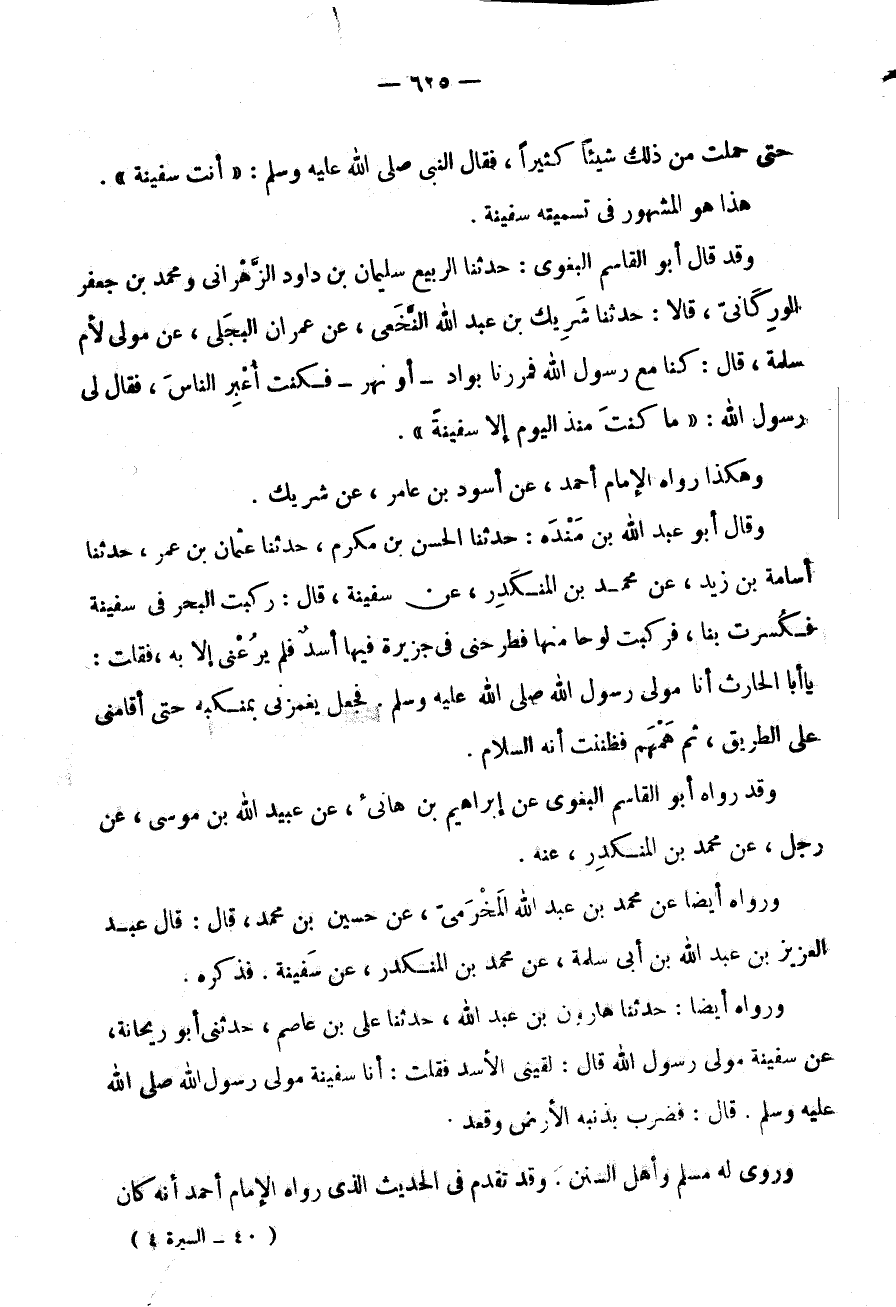 وَقَدْ قَالَ أَبُو الْقَاسِم الْبَغَوِيّ: حَدثنَا الرَّبِيعِ سُلَيْمَانُ بْنُ دَاوُدَ الزَّهْرَانِيُّ وَمُحَمَّدُ بْنُ جَعْفَر الوركانى، قَالَا: حَدثنَا شَرِيكُ بْنُ عَبْدِ اللَّهِ النَّخَعِيُّ، عَنْ عِمْرَانَ الْبَجَلِيِّ، عَنْ مَوْلًى لِأُمِّ سَلَمَةَ، قَالَ: كُنَّا مَعَ رَسُول الله فَمَرَرْنَا بِوَادٍ - أَوْ نَهَرٍ - فَكُنْتُ أُعَبِّرُ النَّاسَ، فَقَالَ لى رَسُول الله: " مَا كُنْتَ مُنْذُ الْيَوْمِ إِلَّا سَفِينَةَ ".