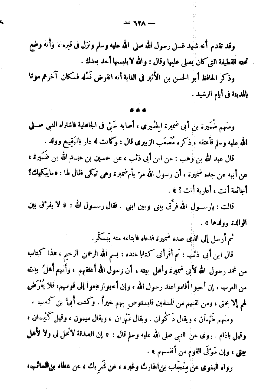قَالَ ابْنُ أَبِي ذِئْبٍ: ثُمَّ أَقْرَأَنِي كِتَابًا عِنْدَهُ: بِسْمِ اللَّهِ الرَّحْمَنِ الرَّحِيمِ، هَذَا كِتَابٌ مِنْ مُحَمَّدٍ رَسُولِ اللَّهِ لِأَبِي ضُمَيْرَةَ وَأهل بَيته، أَن رَسُول الله أَعْتَقَهُمْ، وَأَنَّهُمْ أَهْلُ بَيْتٍ