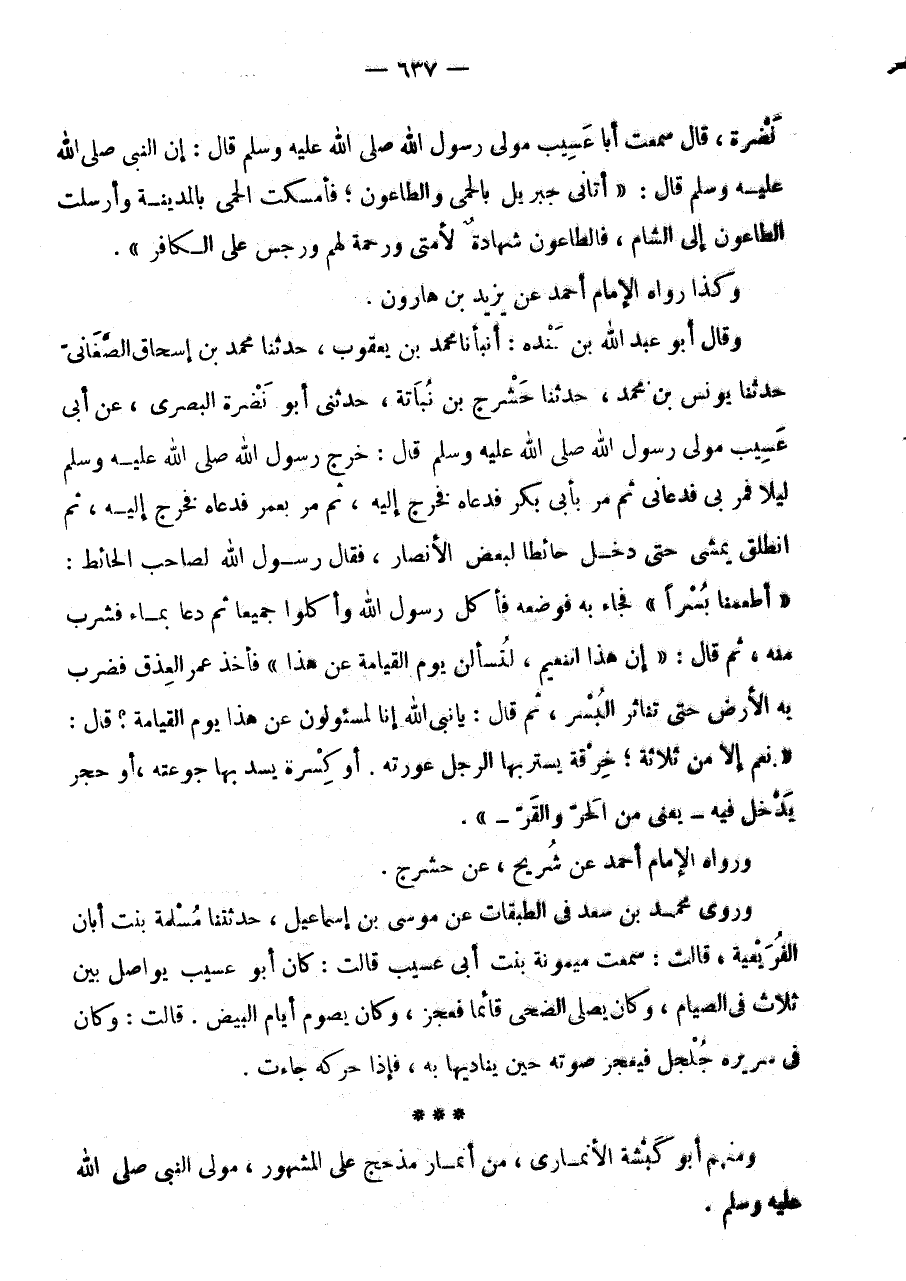 نَضرة، قَالَ سَمِعْتُ أَبَا عَسِيبٍ مَوْلَى رَسُولِ اللَّهِ صَلَّى اللَّهُ عَلَيْهِ وَسَلَّمَ قَالَ: أَنَّ النَّبِيَّ صَلَّى اللَّهُ عَلَيْهِ وَسَلَّمَ قَالَ: " أَتَانِي جِبْرِيلُ بِالْحُمَّى وَالطَّاعُونِ ; فَأَمْسَكْتُ الْحُمَّى بِالْمَدِينَةِ وَأَرْسَلْتُ الطَّاعُونَ إِلَى الشَّامِ، فَالطَّاعُونُ شَهَادَةٌ لِأُمَّتِي وَرَحْمَةٌ لَهُمْ وَرِجْسٌ عَلَى الْكَافِرِ ".