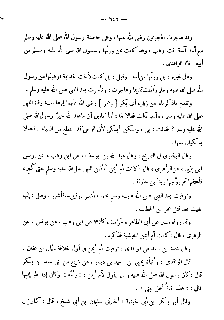 وَقَالَ الْبُخَارِيُّ فِي التَّارِيخِ: وَقَالَ عَبْدُ اللَّهِ بْنُ يُوسُف، عَن ابْن وهب، عَن يُونُس ابْن يَزِيدَ، عَنِ الزُّهْرِيِّ، قَالَ: كَانَتْ أُمُّ أَيْمَنَ تَحْضُنُ النَّبِيَّ صَلَّى اللَّهُ عَلَيْهِ وَسَلَّمَ حَتَّى كَبِرَ، فَأَعْتَقَهَا ثُمَّ زَوَّجَهَا زَيْدَ بْنَ حَارِثَةَ.