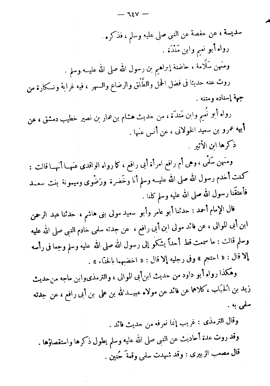 قَالَ الْإِمَامُ أَحْمَدُ: حَدَّثَنَا أَبُو عَامِرٍ وَأَبُو سَعِيدٍ مَوْلَى بَنِي هَاشِمٍ، حَدَّثَنَا عَبْدُ الرَّحْمَن ابْن أَبِي الْمَوَالِي، عَنْ فَائِدٍ مَوْلَى ابْنِ أَبِي رَافِعٍ، عَنْ جَدَّتِهِ سَلْمَى خَادِمِ النَّبِيِّ صَلَّى الله عَلَيْهِ وَسلم قَالَت: مَا سَمِعت قطّ أحدا يَشْكُو إِلَى رَسُولِ اللَّهِ صَلَّى اللَّهُ عَلَيْهِ وَسَلَّمَ وَجَعًا فِي رَأْسِهِ إِلَّا قَالَ: " احْتَجِمْ " وفى رِجْلَيْهِ إِلَّا قَالَ: " اخْضِبْهُمَا بِالْحِنَّاءِ ".