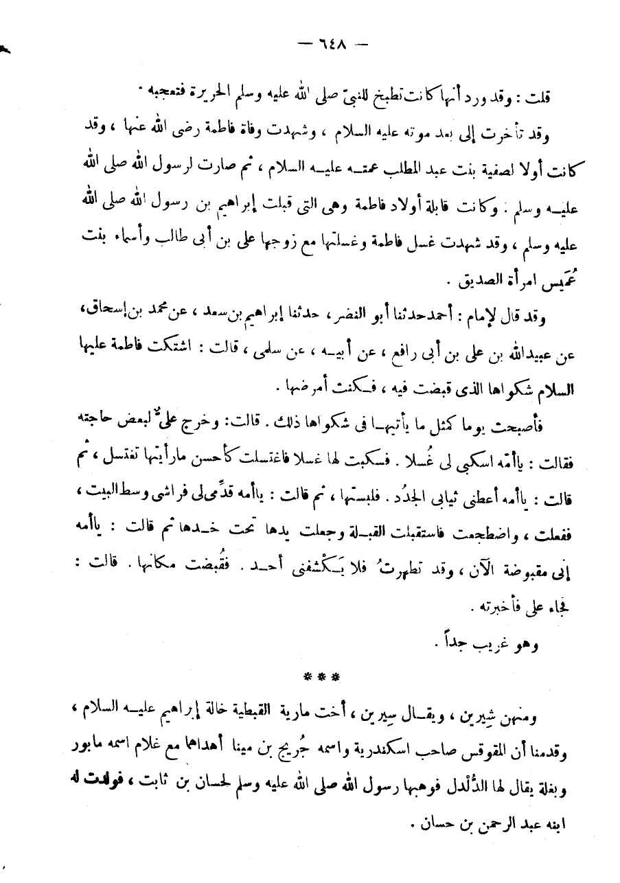 * * * ومنهن شيرين، وَيُقَال سِيرِين، أُخْتُ مَارِيَةَ الْقِبْطِيَّةِ خَالَةُ إِبْرَاهِيمَ عَلَيْهِ السَّلَامُ، وَقدمنَا أَنَّ الْمُقَوْقِسَ صَاحِبَ إِسْكَنْدَرِيَّةَ وَاسْمُهُ جُرَيْجُ بْنُ مِينَا أَهْدَاهُمَا مَعَ غُلَامٍ اسْمُهُ مَأْبُورٌ وَبَغْلَةٍ يُقَالُ لَهَا الدُّلْدُلُ فَوَهَبَهَا رَسُولُ اللَّهِ صَلَّى اللَّهُ عَلَيْهِ وَسَلَّمَ لِحَسَّانَ بْنِ ثَابِتٍ، فَوَلَدَتْ لَهُ ابْنَهُ عَبْدَ الرَّحْمَنِ بْنَ حَسَّانَ.