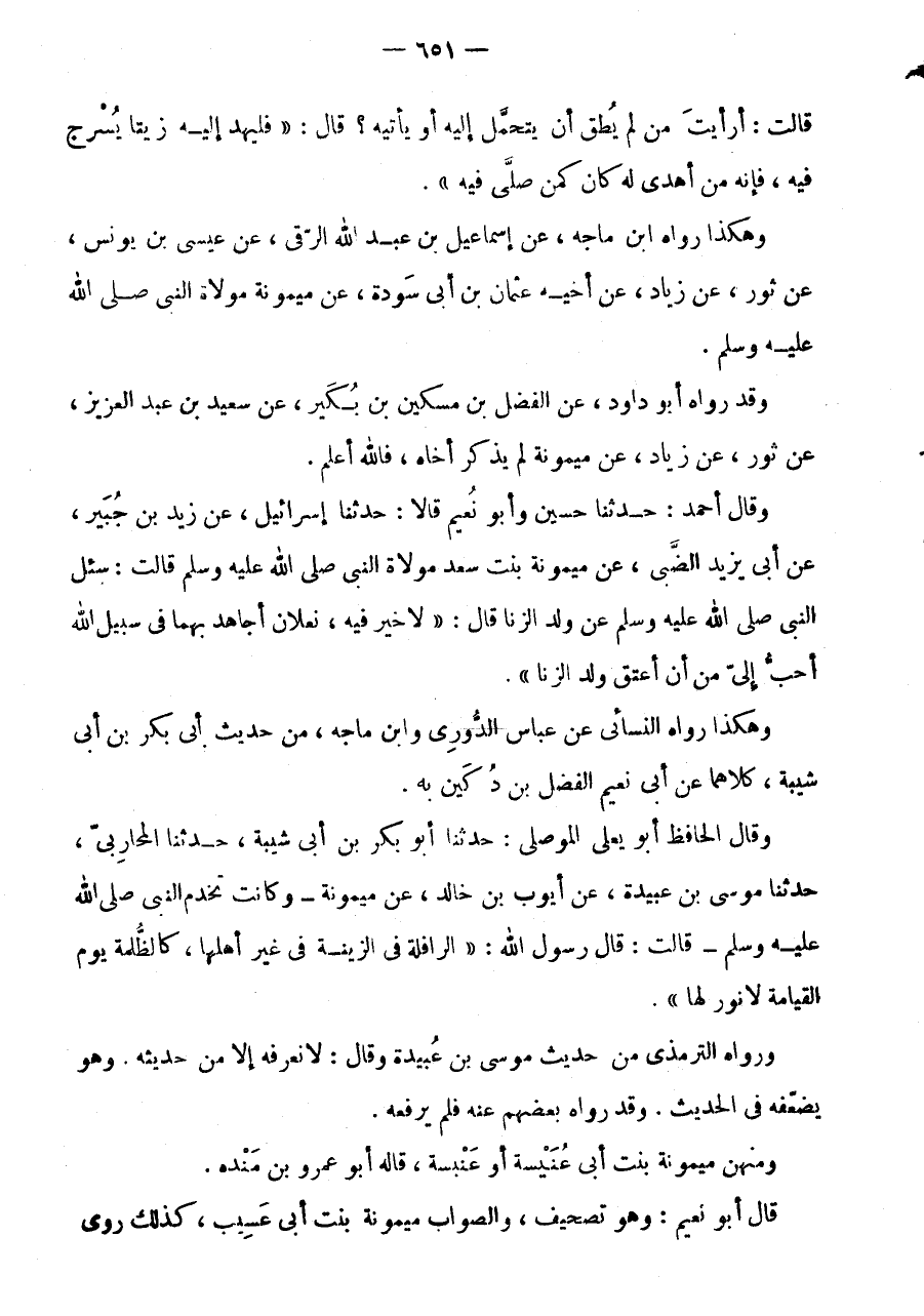 قَالَتْ: أَرَأَيْتَ مَنْ لَمْ يُطِقْ أَنْ يَتَحَمَّلَ إِلَيْهِ أَوْ يَأْتِيَهُ؟ قَالَ: " فَلْيُهْدِ إِلَيْهِ زَيْتًا يُسْرَجُ فِيهِ، فَإِنَّهُ مَنْ أَهْدَى لَهُ كَانَ كَمَنْ صَلَّى فِيهِ ".