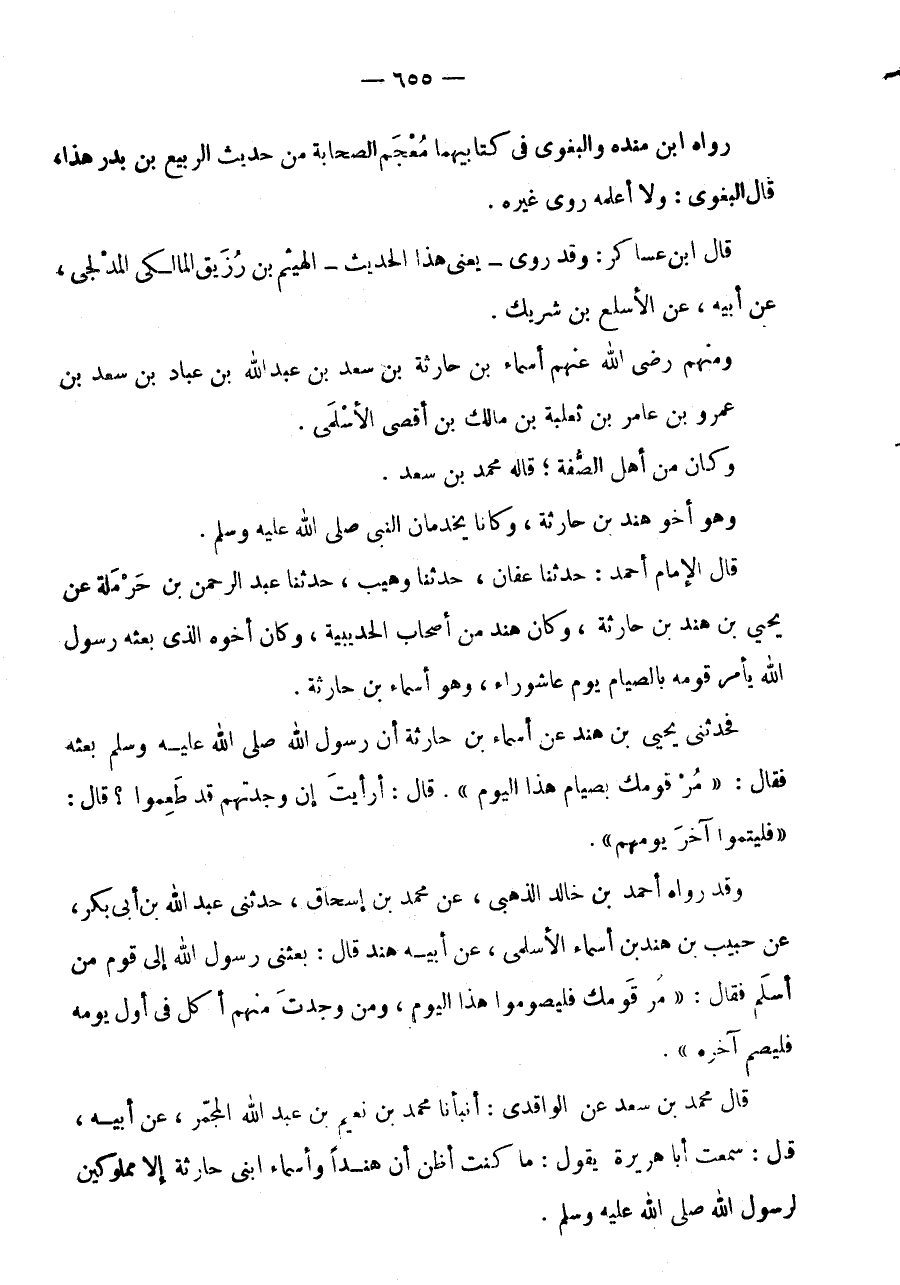 قَالَ الْإِمَامُ أَحْمَدُ: حَدَّثَنَا عَفَّانُ، حَدَّثَنَا وُهَيْبٌ، حَدَّثَنَا عَبْدُ الرَّحْمَنِ بْنُ حَرْمَلَةَ عَنْ يَحْيَى بْنِ هِنْدِ بْنِ حَارِثَةَ، وَكَانَ هِنْدٌ مِنْ أَصْحَابِ الْحُدَيْبِيَةِ، وَكَانَ أَخُوهُ الَّذِي بَعَثَهُ رَسُولُ اللَّهِ يَأْمُرُ قَوْمَهُ بِالصِّيَامِ يَوْمَ عَاشُورَاءَ، وَهُوَ أَسْمَاءُ بْنُ حَارِثَةَ.