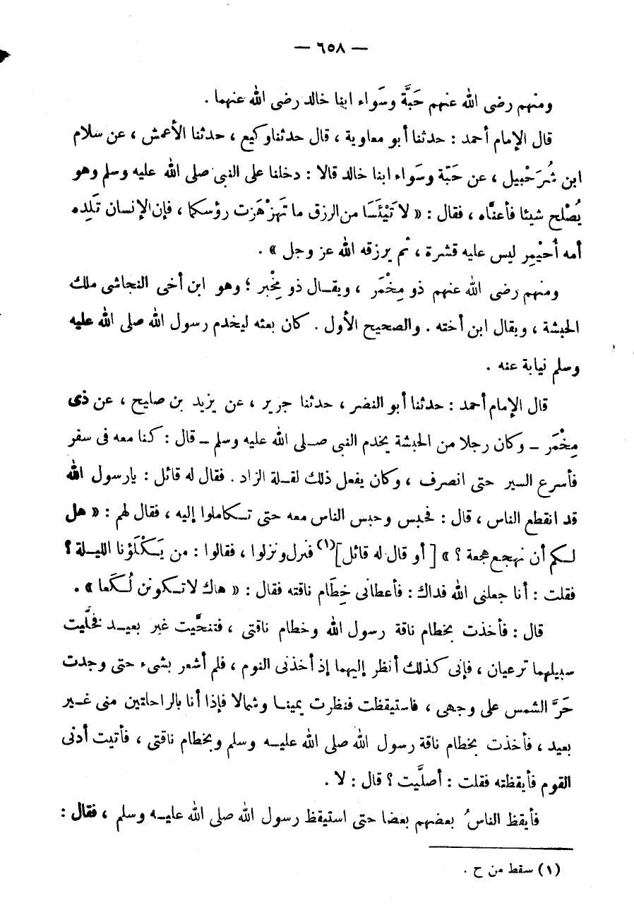 سَبِيلَهُمَا ترعيان، فإنى كَذَلِك أنظر إِلَيْهِمَا إِذْ أَخَذَنِي النّوم، فَلم أشعر بشئ حَتَّى وَجَدْتُ حَرَّ الشَّمْسِ عَلَى وَجْهِي، فَاسْتَيْقَظْتُ فَنَظَرْتُ يَمِينًا وَشِمَالًا فَإِذَا أَنَا بِالرَّاحِلَتَيْنِ مِنِّي غَيْرَ بَعِيدٍ، فَأَخَذْتُ بِخِطَامِ نَاقَةِ رَسُولِ اللَّهِ صَلَّى اللَّهُ عَلَيْهِ وَسَلَّمَ وَبِخِطَامِ نَاقَتِي، فَأَتَيْتُ أَدْنَى الْقَوْمِ فَأَيْقَظْتُهُ فَقُلْتُ: أَصَلَّيْتَ؟ قَالَ: لَا.