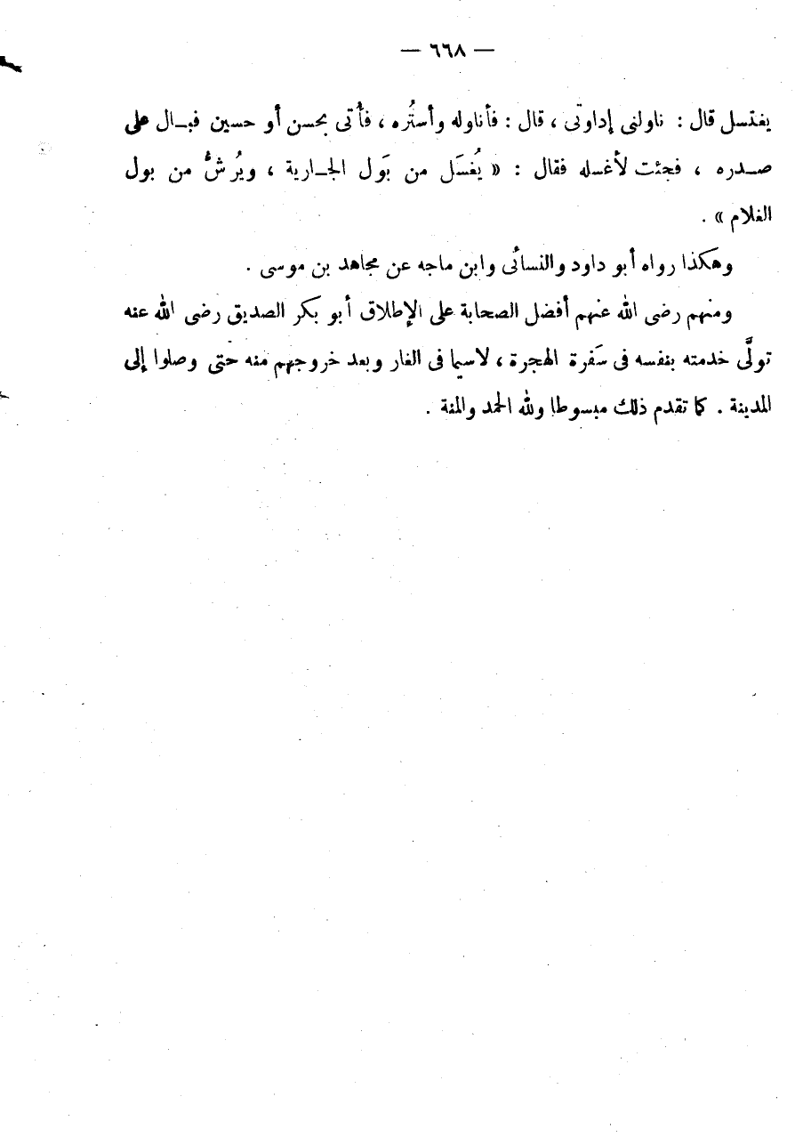 يَغْتَسِلَ قَالَ: نَاوِلْنِي إِدَاوَتِي، قَالَ: فَأُنَاوِلُهُ وَأَسْتُرُهُ، فَأُتِيَ بِحَسَنٍ أَوْ حُسَيْنٍ فَبَالَ عَلَى صَدْرِهِ، فَجِئْتُ لِأَغْسِلَهُ فَقَالَ: " يُغْسَلُ مِنْ بَوْلِ الْجَارِيَةِ، ويرش من بَوْل الْغُلَام ".