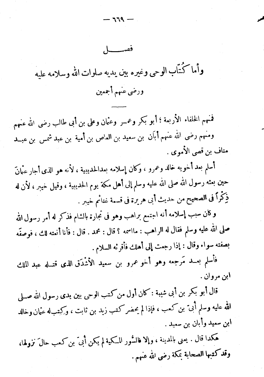 فصل وَأما كُتَّابُ الْوَحْيِ وَغَيْرِهِ بَيْنَ يَدَيْهِ صَلَوَاتُ اللَّهِ وَسَلَامُهُ عَلَيْهِ وَرَضِيَ عَنْهُمْ أَجْمَعِينَ