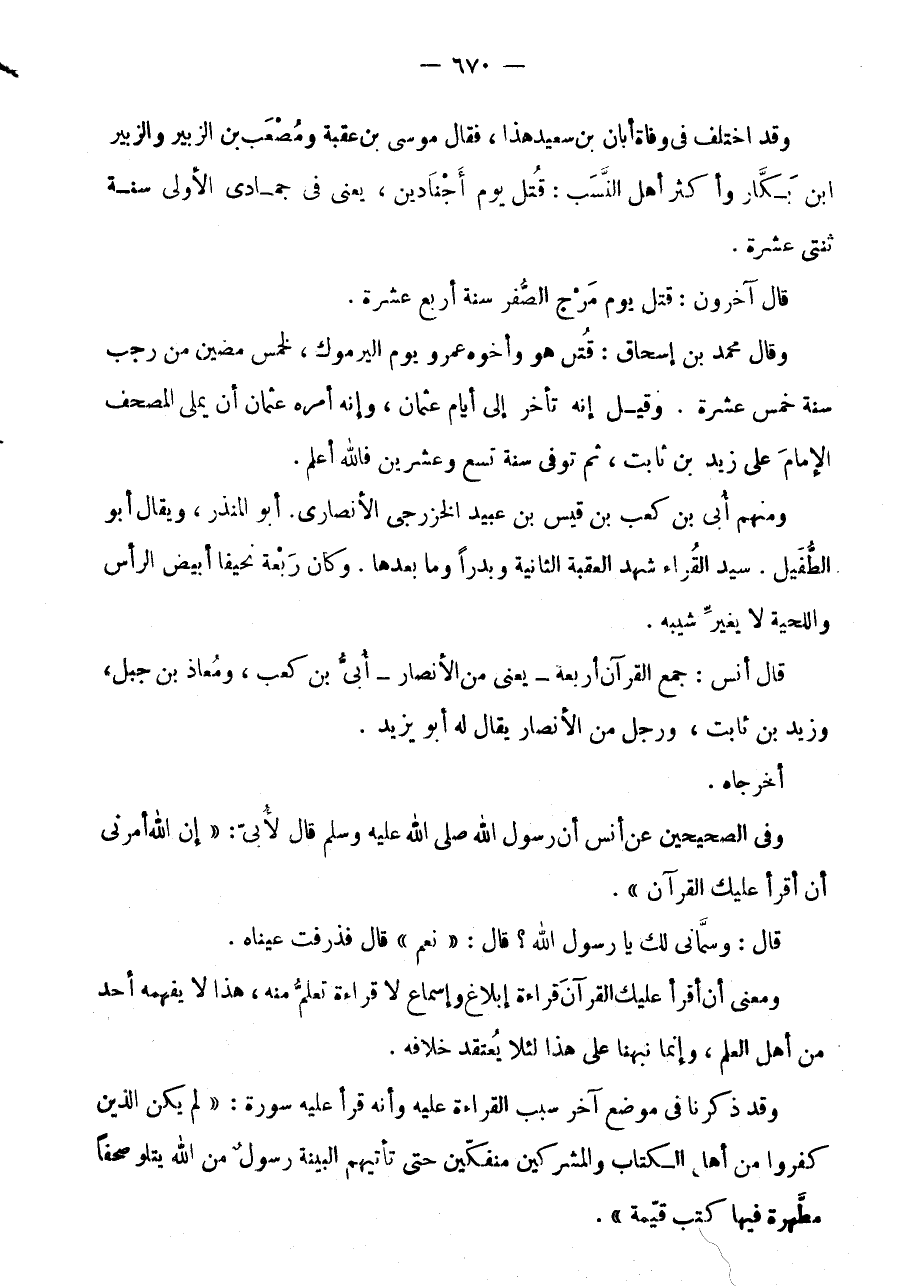 قَالَ أَنَسٌ: جَمَعَ الْقُرْآنَ أَرْبَعَةٌ - يَعْنِي مِنَ الْأَنْصَارِ - أُبَيُّ بْنُ كَعْبٌ، وَمُعَاذُ بْنُ جَبَلٍ، وَزَيْدُ بْنُ ثَابِتٍ، وَرَجُلٌ من الانصار يُقَال لَهُ أَبُو يزِيد.