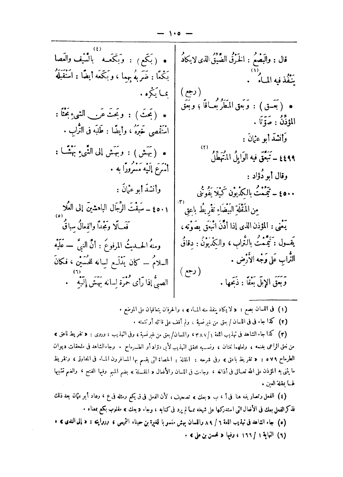 (¬4) الفعل وتصاريفه هنا فى أ، ب «بعك» تصحيف، لأن الفعل فى ق بكع ومثله فى ع، وعاد أبو عثمان بعد ذلك فذكر الفعل بعك فى الأفعال التى استدركها على شيخه مما لم يرد فى كتابه، وجاء «بعك» مقلوب بكع بمعناه.