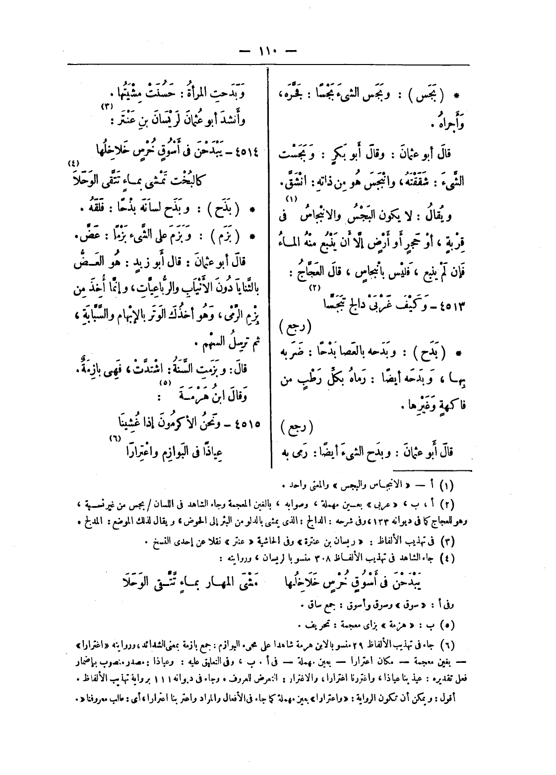 ويقال: لا يكون البجس والانبجاس (¬1) فى قربة، أو حجر أو أرض إلّا أن ينبع منه الماء فإن لم ينبع، فليس بانبجاس، قال العجّاج: