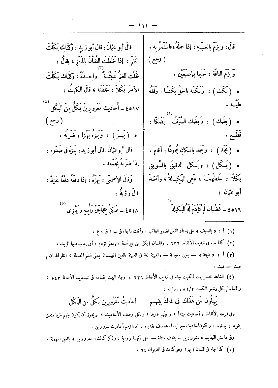 (¬4) الشاهد عجز بيت للكميت جاء فى تهذيب الألفاظ 636، وجاء البيت بتمامه فى تهذيب الألفاظ 543، واللسان/ بكل وشعر الكميت 2/ 51 وروايته: