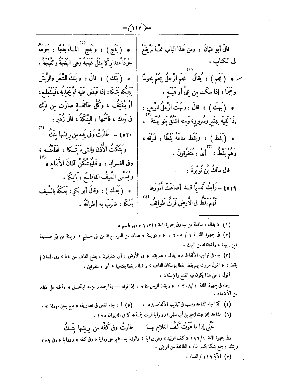 وبتكت الأذن والشئ بتكا: قطعته، وفى القرآن: «فَلَيُبَتِّكُنَّ آذانَ الْأَنْعامِ» (¬7) ويسمّى السّيف القاطع: باتكا.