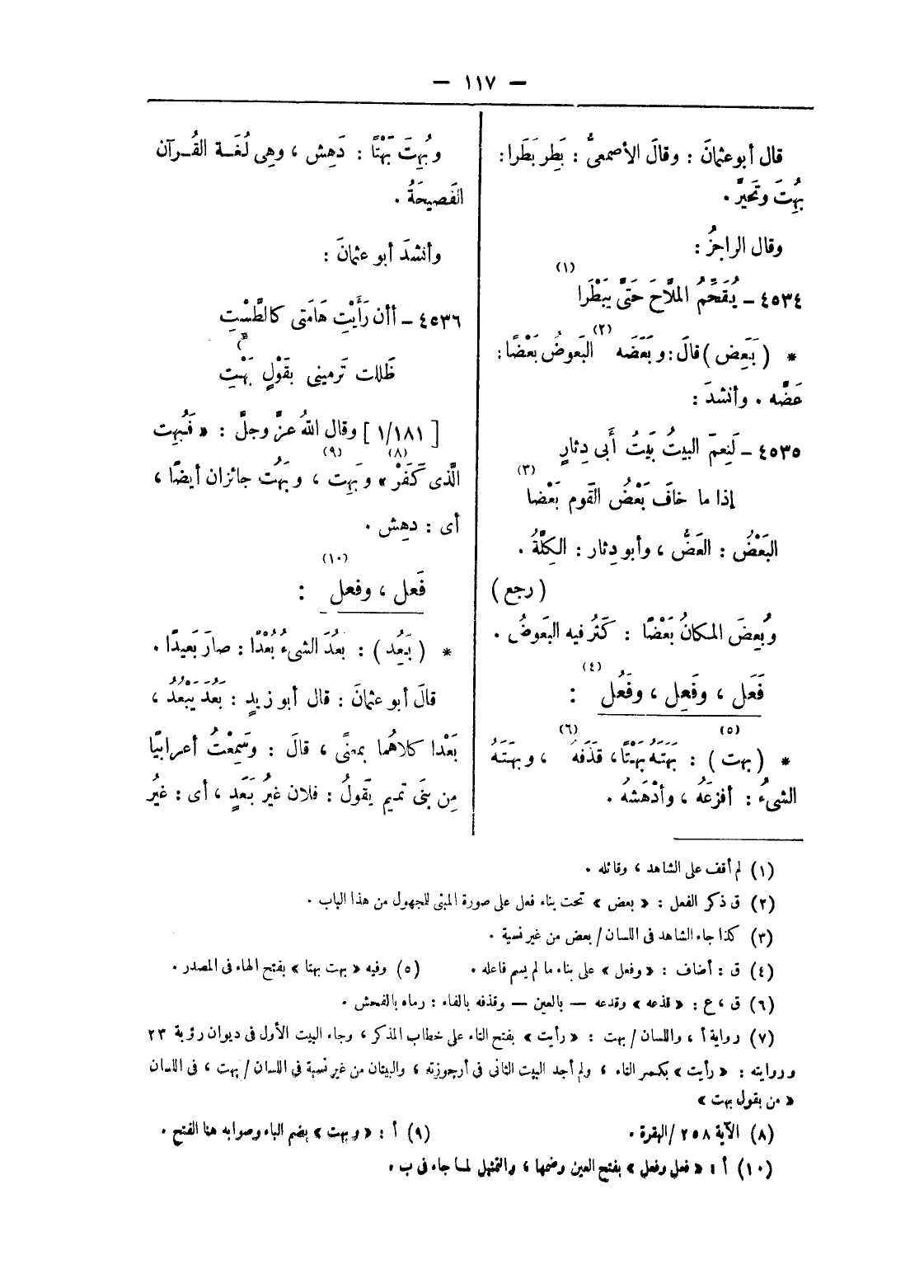 (¬7) رواية أ، واللسان/ بهت: «رأيت» بفتح التاء على خطاب المذكر، وجاء البيت الأول فى ديوان رؤبة 23 وروايته: «رأيت» بكسر التاء، ولم أجد البيت الثانى فى أرجوزته، والبيتان من غير نسبة فى اللسان/ بهت، فى اللسان «من يقول بهت»