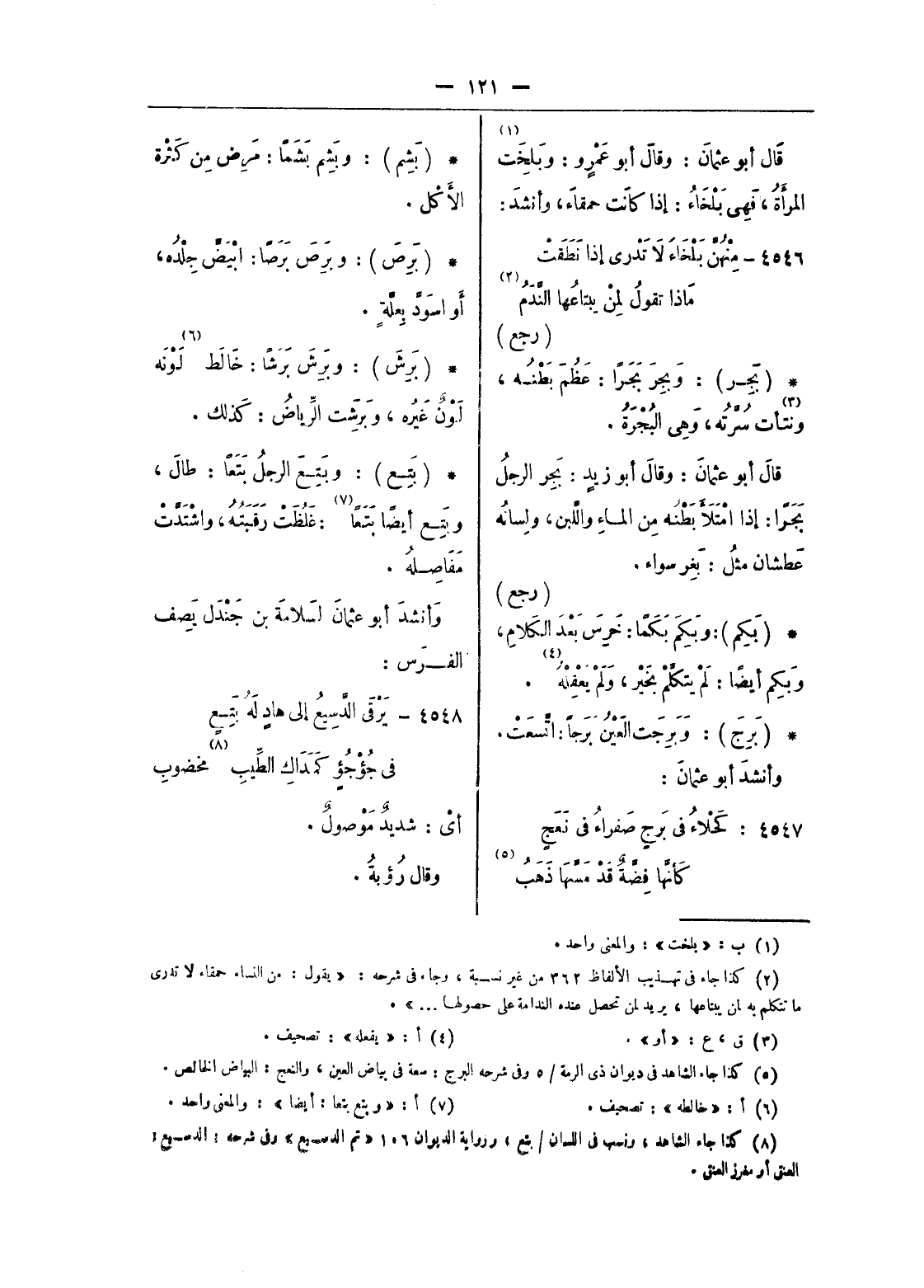 (¬2) كذا جاء فى تهذيب الألفاظ 362 من غير نسبة، وجاء فى شرحه: «يقول: من النساء حمقاء لا تدرى ما تتكلم به لمن يبتاعها، يريد لمن تحصل عنده الندامة على حصولها ...».