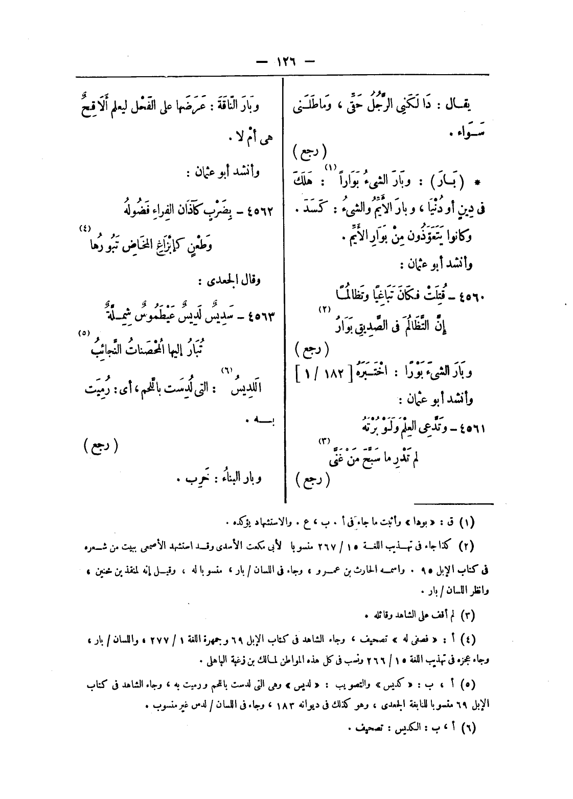 (¬2) كذا جاء فى تهذيب اللغة 15/ 267 منسوبا لأبى مكعت الأسدى وقد استشهد الأصمعى ببيت من شعره فى كتاب الإبل 95. واسمه الحارث بن عمرو، وجاء فى اللسان/ بار، منسوبا له، وقيل إنه لمنقذ بن خنين، وانظر اللسان/ بار.