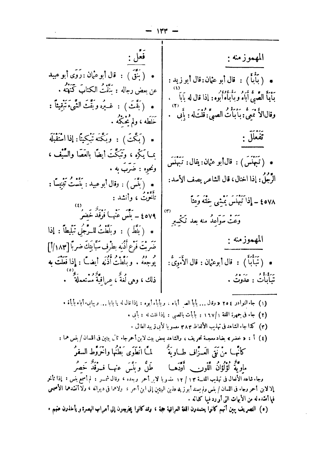 (¬1) جاء النوادر 254 «وقال ... بأبأ الصبي أياه. وبأبأه أبوه: إذا قال له يا بابا ... ويبابئ أباه بأبأة.