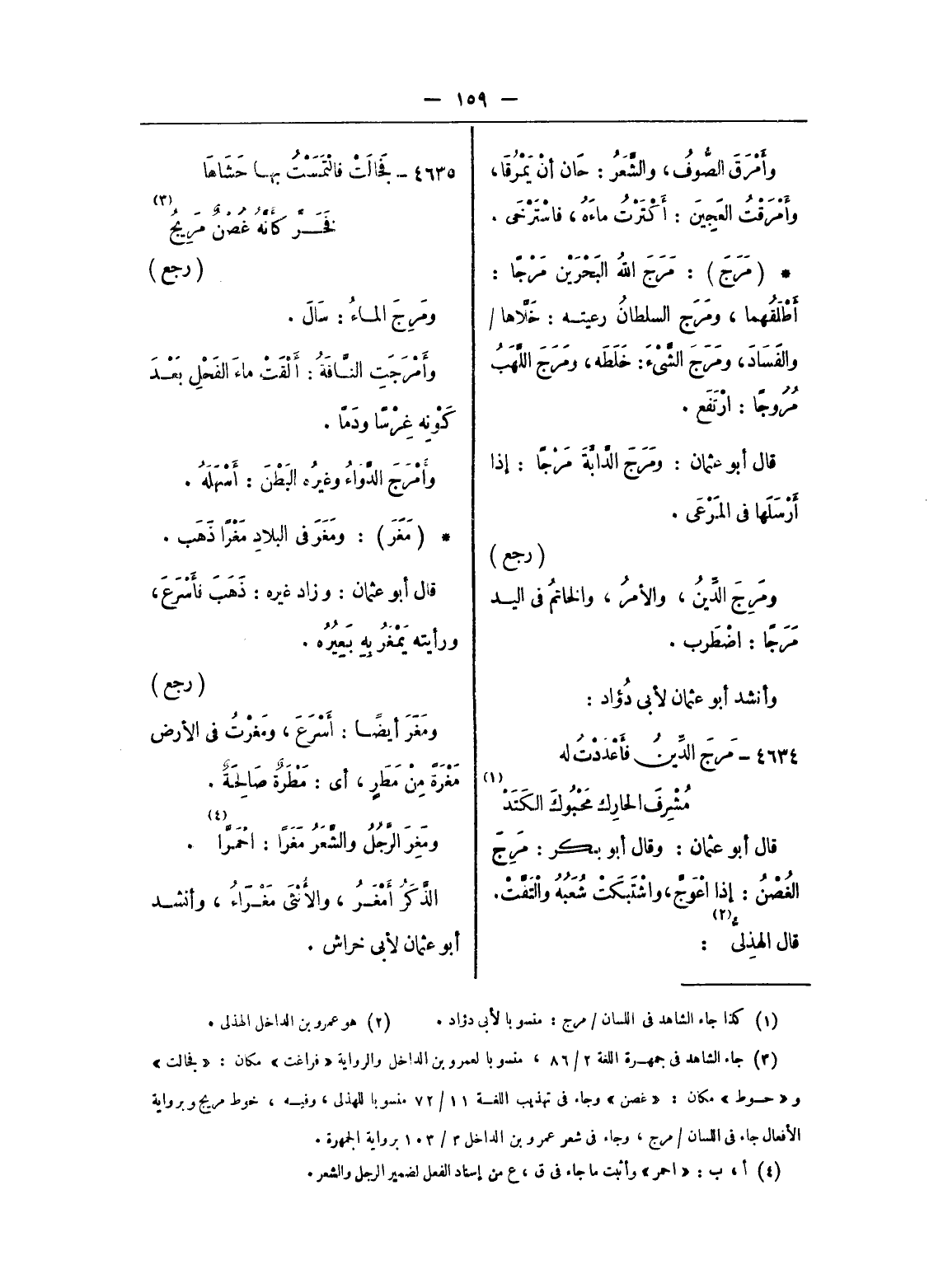 (¬3) جاء الشاهد فى جمهرة اللغة 2/ 86، منسوبا لعمرو بن الداخل والرواية «فراغت» مكان: «فجالت» و «حوط» مكان: «غصن» وجاء فى تهذيب اللغة 11/ 72 منسوبا للهذلى، وفيه، خوط مريج وبرواية الأفعال جاء فى اللسان/ مرج، وجاء فى شعر عمرو بن الداخل 3/ 103 برواية الجمهرة.