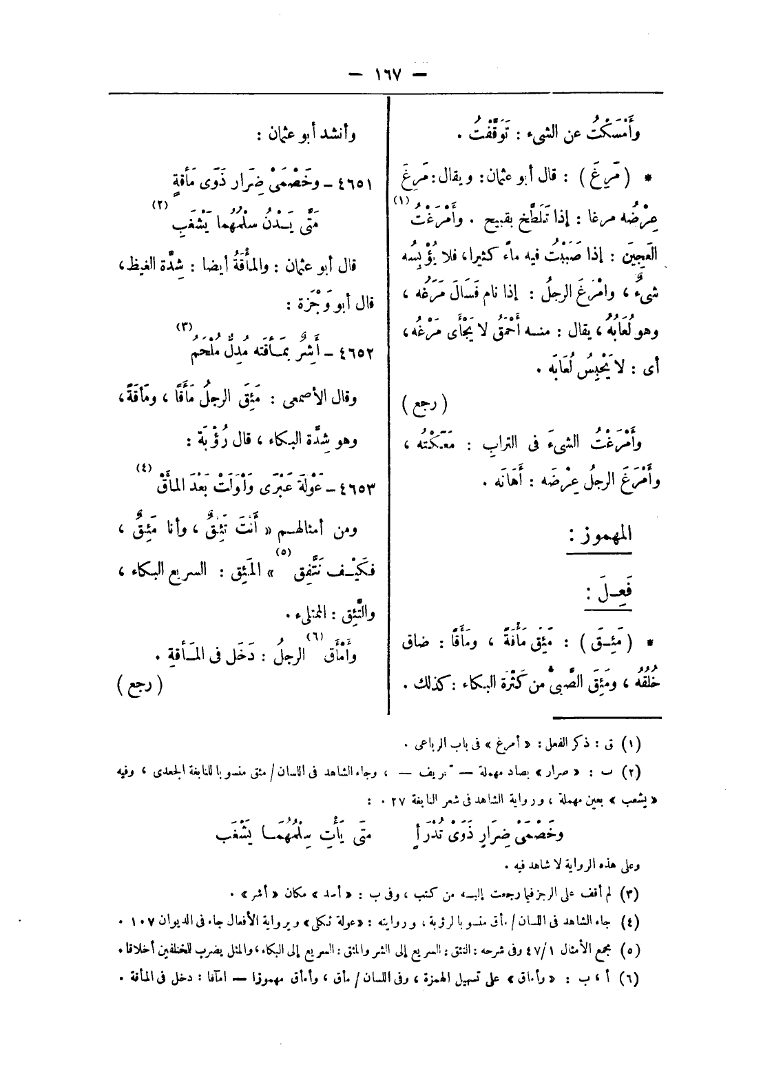 (¬2) ب: «صرار» بصاد مهملة - تحريف -، وجاء الشاهد فى اللسان/ مئق منسوبا للنابغة الجعدى، وفيه «يشعب» بعين مهملة، ورواية الشاهد فى شعر النابغة 27.: