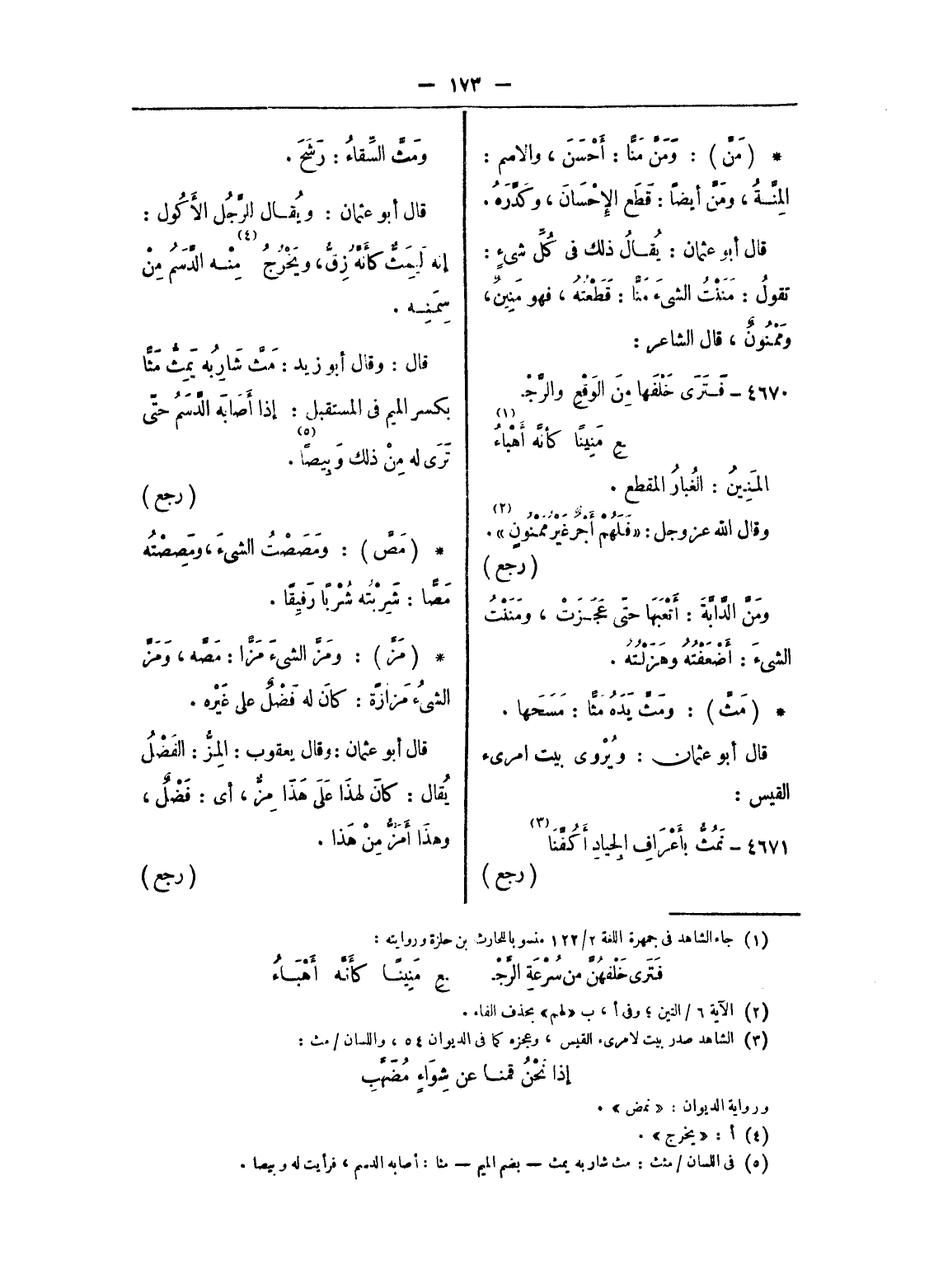 (¬5) وفي اللسان/ مثث: مث شاربه يمث - بضم الميم - مثا: أصابه الدسم، فرأيت له وبيصا.