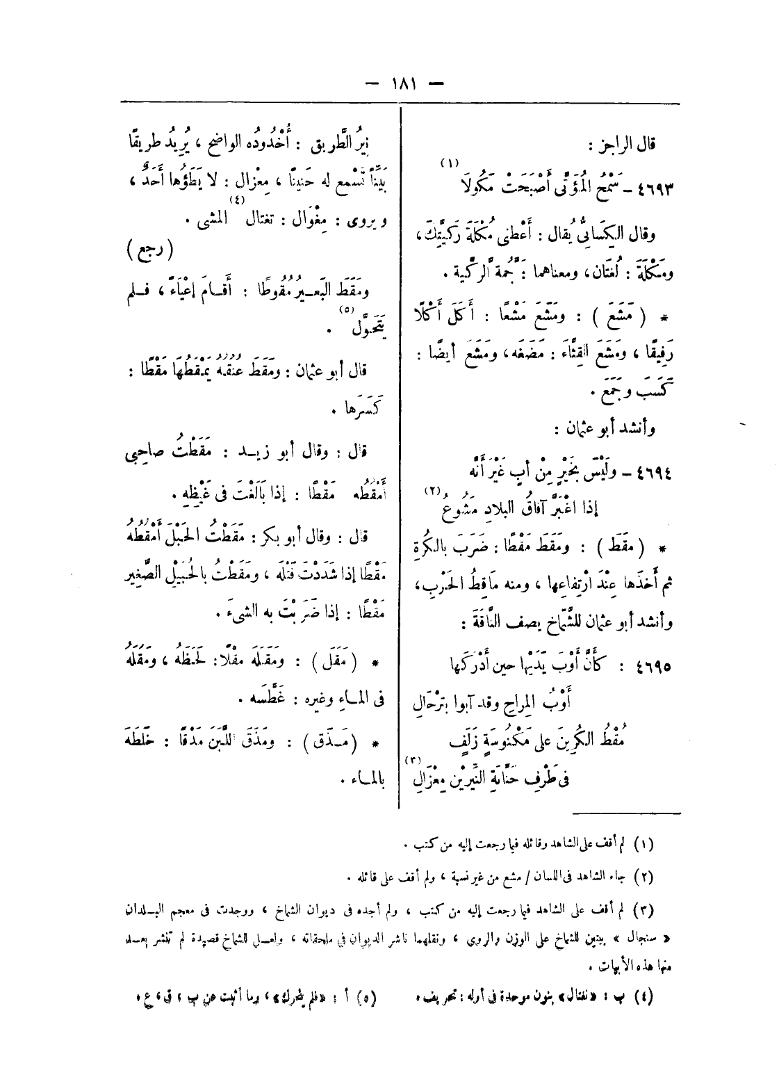 (¬3) لم أقف على الشاهد فيما رجعت إليه من كتب، ولم أجده فى ديوان الشماخ، ووجدت فى معجم البلدان «سنجال» بيتين للشماخ على الوزن والروى، ونقلهما ناشر الديوان فى ملحقاته، ولعل للشماخ قصيدة لم تنشر بعده منها هذه الأبيات.