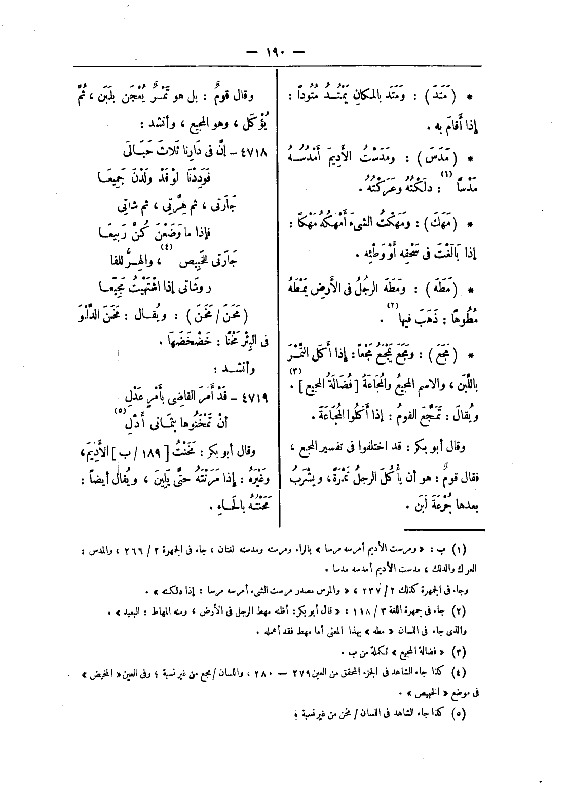 (¬4) كذا جاء الشاهد فى الجزء المحقق من العين 279 - 280، واللسان/ مجع من غير نسبة؛ وفى العين «المخيض» فى موضع «الخبيص».