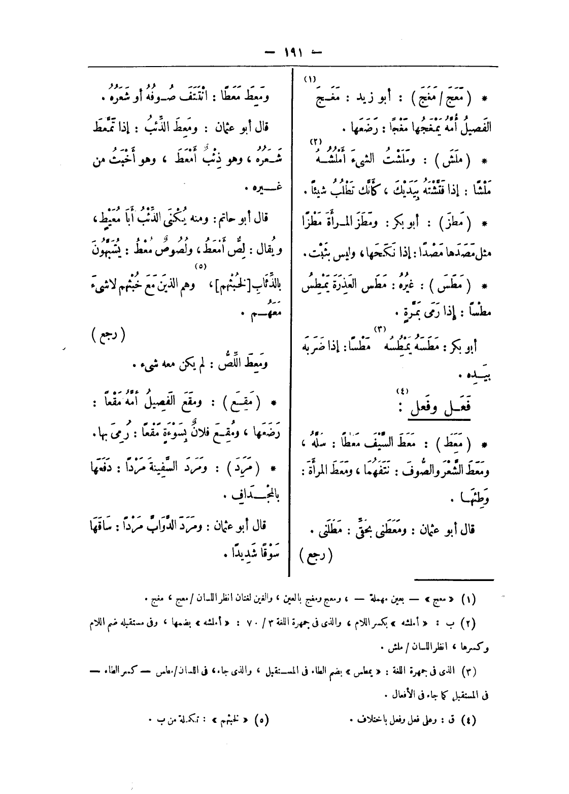 (¬3) الذى فى جمهرة اللغة: «يمطس» بضم الطاء فى المستقبل، والذي جاء، فى اللسان/ مطس - كسر الطاء - فى المستقبل كما جاء فى الأفعال.
