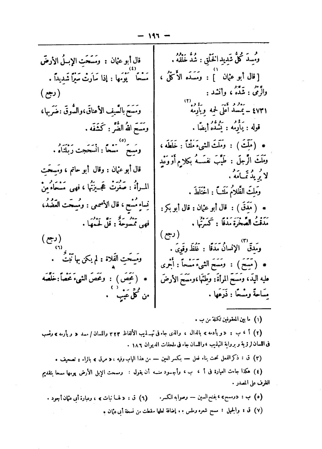 (¬2) أ، ب: «ويأدمه» بالدال، والذى جاء فى تهذيب الألفاظ 323 واللسان/ مسد «ويأرمه» ونسب فى اللسان لرؤبة وبرواية التهذيب، واللسان جاء فى ملحقات الديوان 186.
