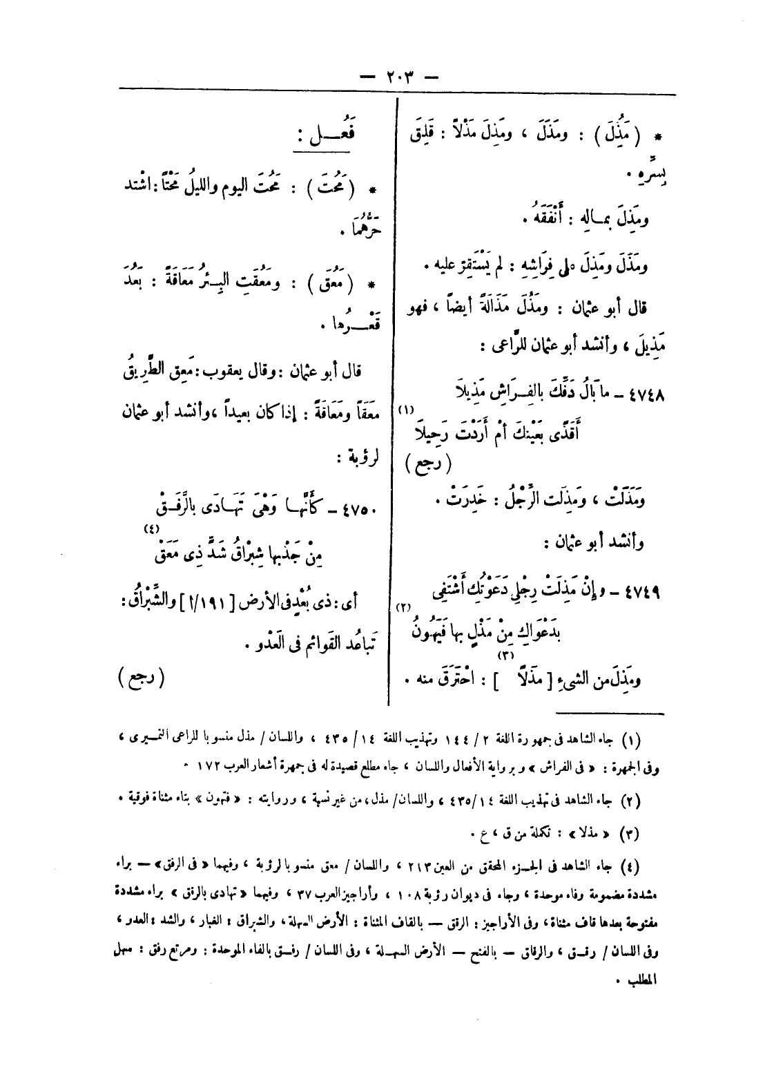(¬4) جاء الشاهد فى الجزء المحقق من العين 213، واللسان/ معق منسوبا لرؤبة، وفيهما «فى الرفق» - براء مشددة مضمومة وفاء موحدة، وجاء فى ديوان رؤبة 108، وأراجيز العرب 37، وفيهما «تهادى بالرفق» براء مشددة مفتوحة بعدها قاف مثناة، وفى الأراجيز: الرقق - بالقاف المثناة: الأرض السهلة، والشبراق: الغبار، والشد: العدو، وفى اللسان/ رقق، والرقاق - بالفتح - الأرض السهلة، وفى اللسان/ رفق بالفاء الموحدة: ومرتع رفق: سهل المطلب.