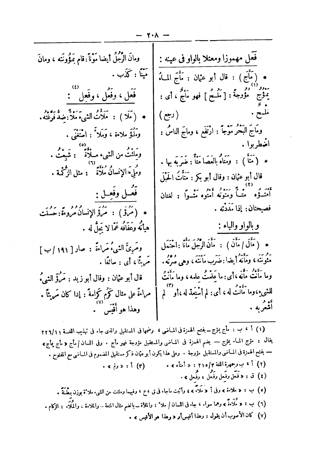 (¬1) أ، ب: مأج يمؤج - بفتح الهمزة فى الماضى، وضمها فى المستقبل والذى جاء فى تهذيب اللغة 11/ 226 يقال: مؤج الماء يمؤج - بضم الهمزة فى الماضى والمستقبل مؤوجة فهو مأج. وفى اللسان/ مأج «مأج يمأج» - بفتح الهمزة فى الماضى والمستقبل مؤوجة. وعلى هذا يكون أبو عثمان ذكر مستقبل المضموم فى الماضى مع المفتوح.