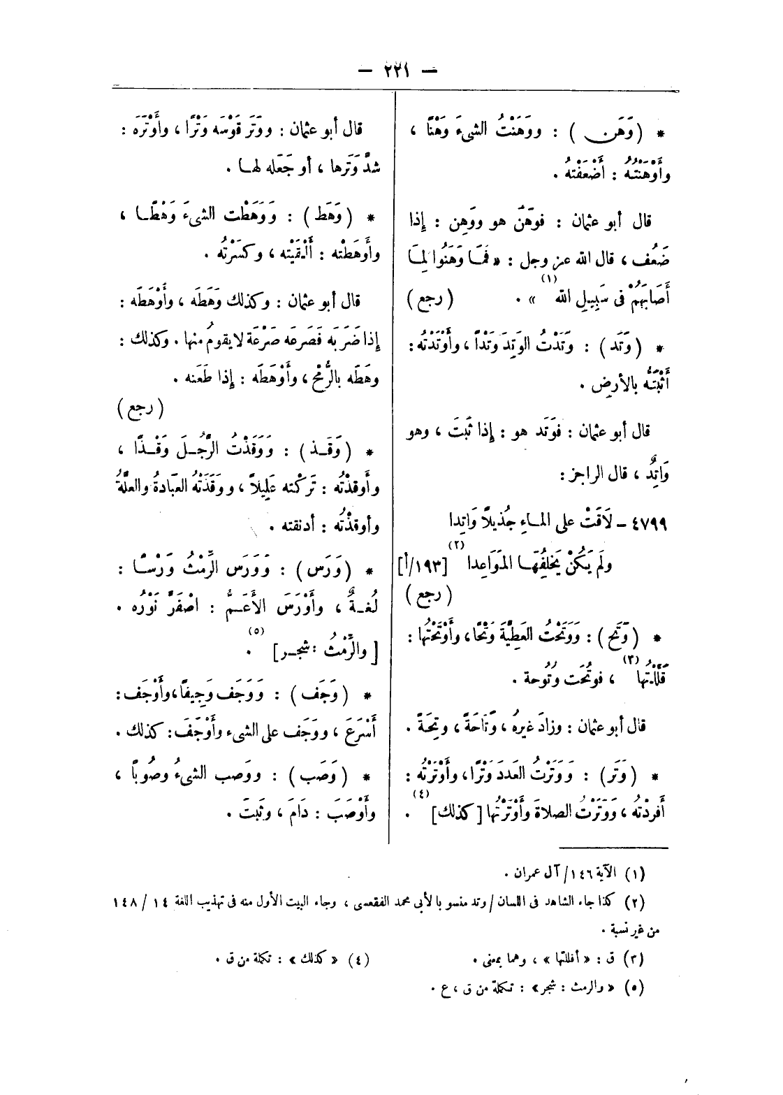 قال أبو عثمان: فوهن هو ووهن: إذا ضعف، قال الله عز وجل: «فَما وَهَنُوا لِما أَصابَهُمْ فِي سَبِيلِ اللَّهِ (¬1)».