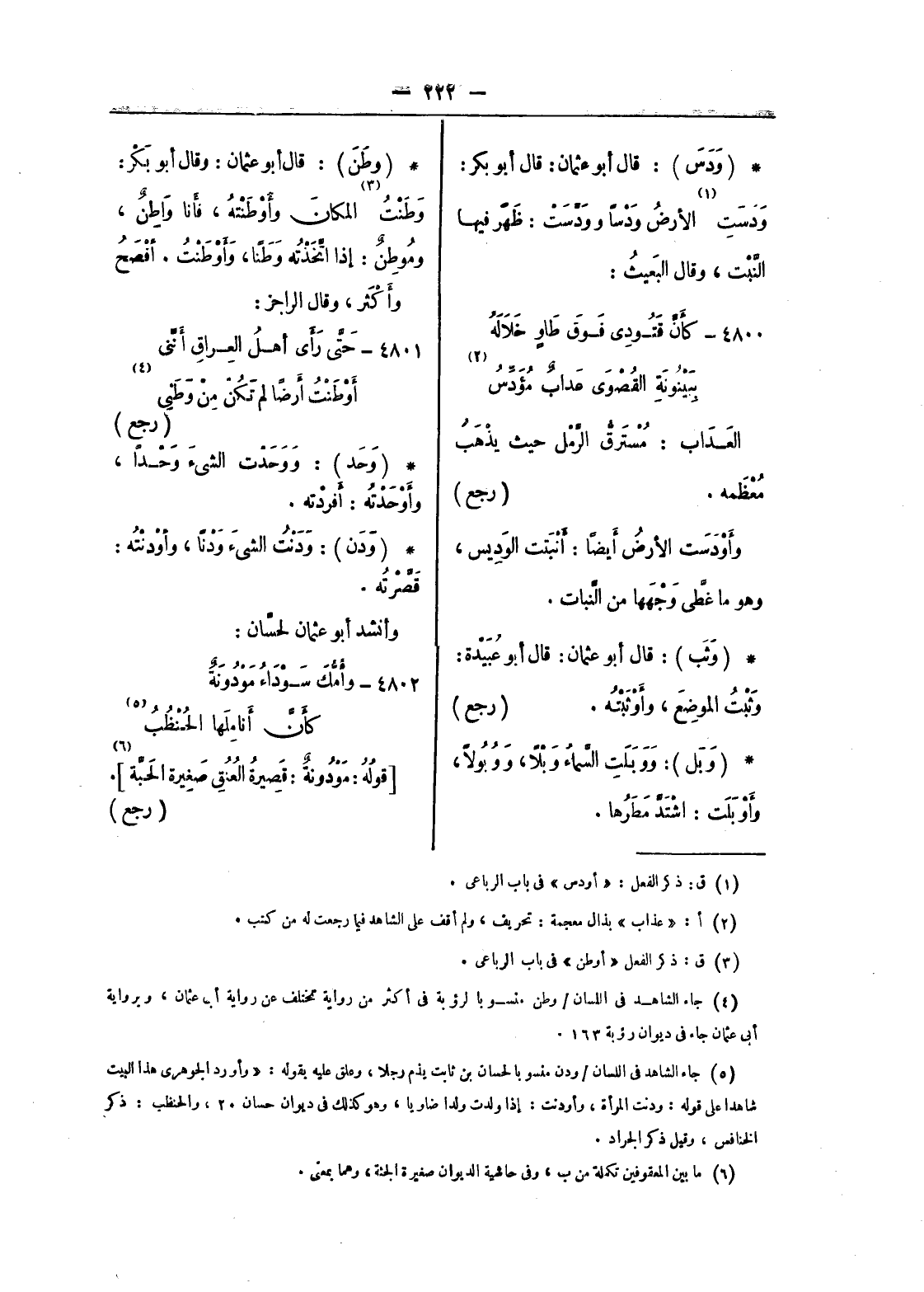(¬4) جاء الشاهد فى اللسان/ وطن منسوبا لرؤبة فى أكثر من رواية تختلف عن رواية أبى عثمان، وبرواية أبى عثمان جاء فى ديوان رؤبة 163.