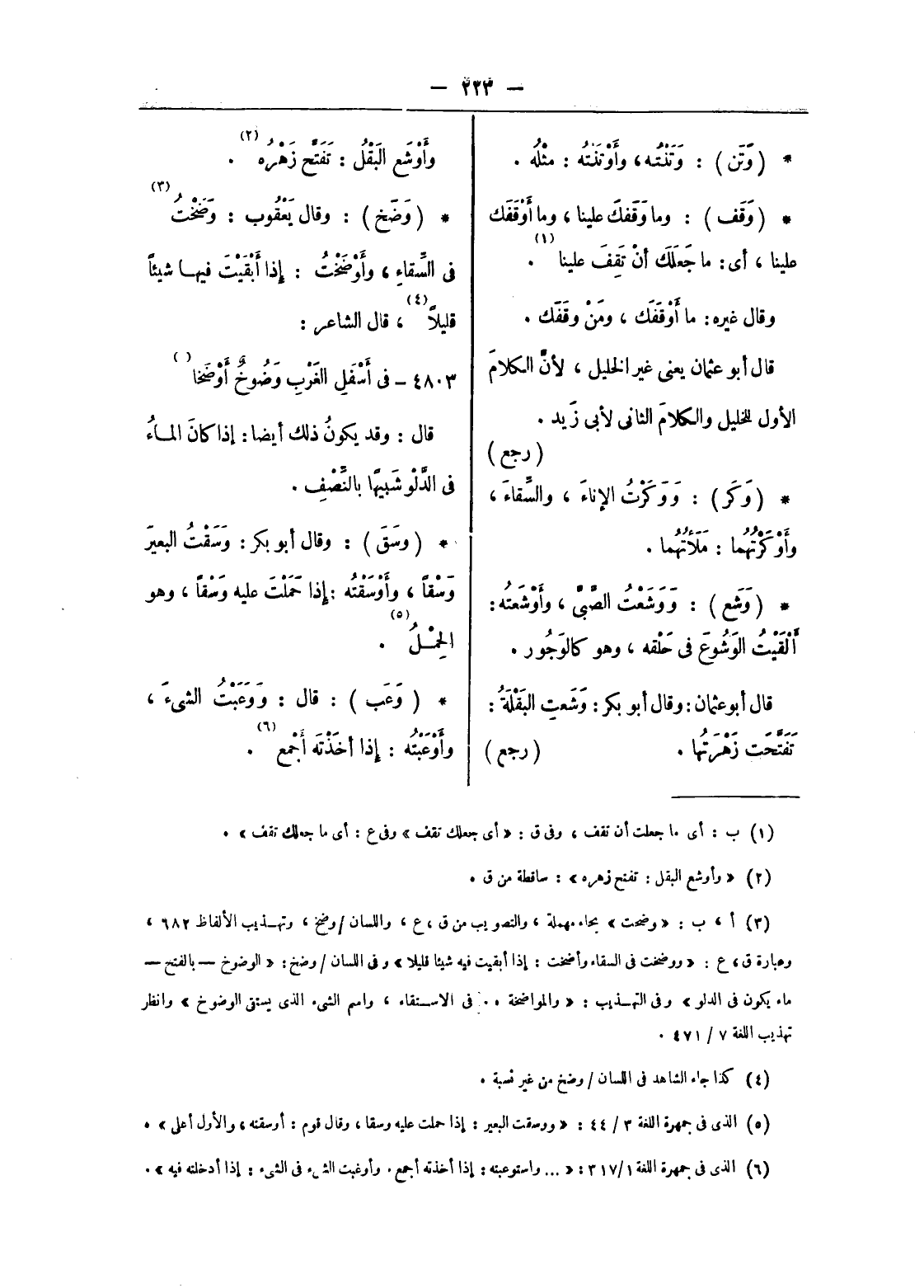 (¬3) أ، ب: «وضحت» بحاء مهملة، والتصويب من ق، ع، واللسان/ وضخ، وتهذيب الألفاظ 682، وعبارة ق، ع: «ووضخت فى السقاء وأضخت: إذا أبقيت فيه شيئا قليلا» وفى اللسان/ وضخ: «الوضوخ - بالفتح - ماء يكون فى الدلو» وفى التهذيب: «والمواضخة .. فى الاستقاء، واسم الشئ الذى يستقى الوضوخ» وانظر تهذيب اللغة 7/ 471.