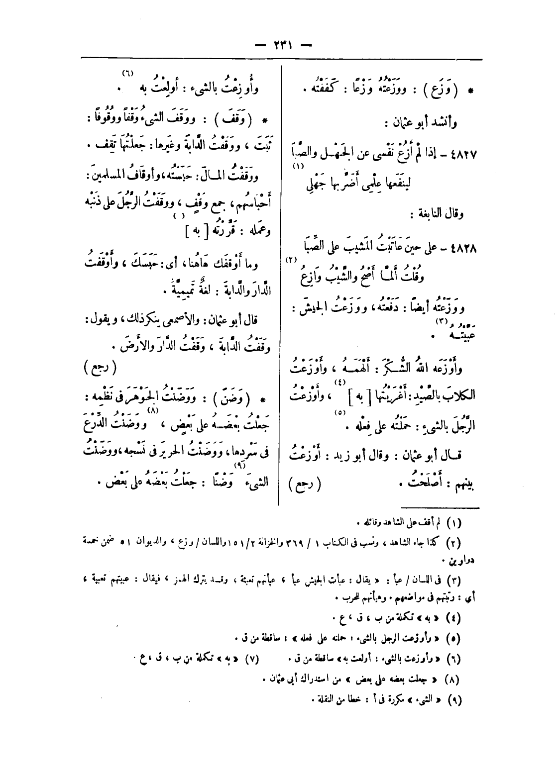 (¬2) كذا جاء الشاهد، ونسب فى الكتاب 1/ 369 والخزانة 2/ 151 واللسان/ وزع، والديوان 51 ضمن خمسة دواوين.