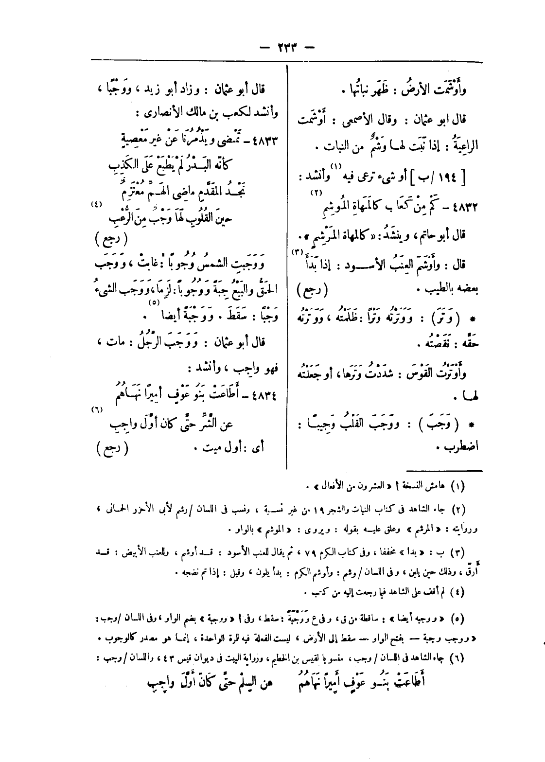 قال أبو عثمان: وزاد أبو زيد، ووجبا، وأنشد لكعب بن مالك الأنصارى: