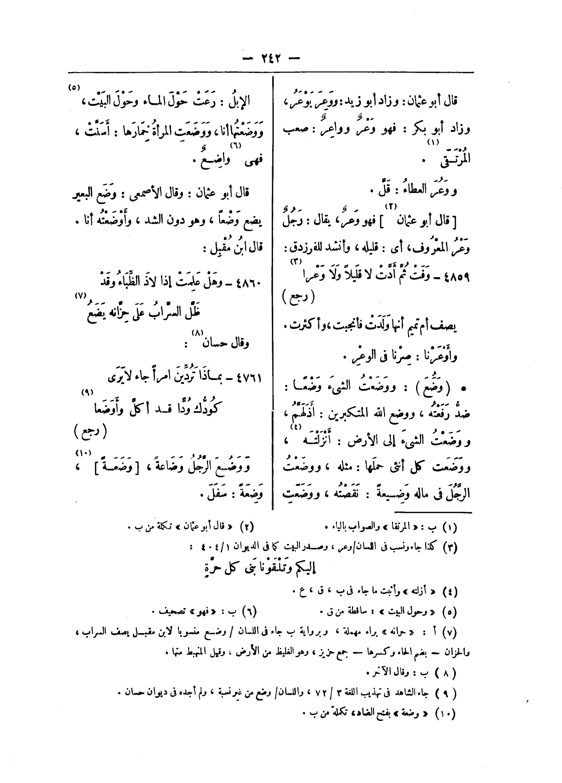 (¬9) جاء الشاهد فى تهذيب اللغة 3/ 72، واللسان/ وضع من غير نسبة، ولم أجده فى ديوان حسان.