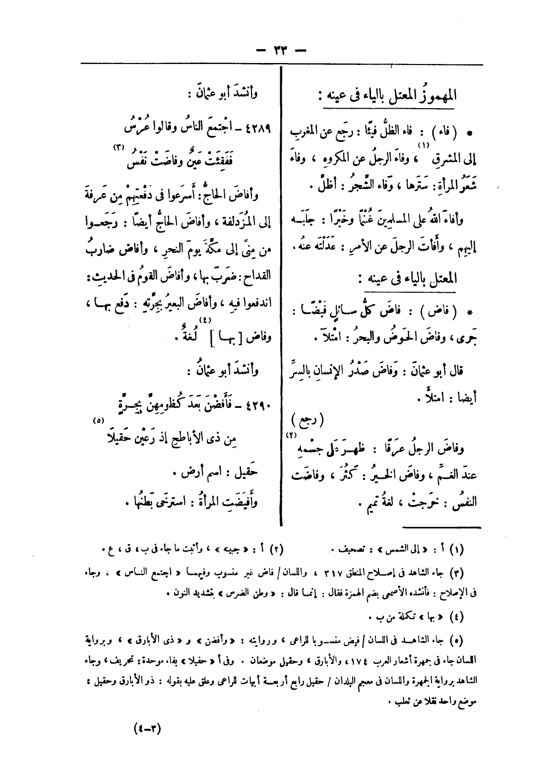 (¬3) جاء الشاهد فى إصلاح المنطق 317، واللسان/ فاض غير منسوب وفيهما «اجتمع الناس». وجاء فى الإصلاح: فأنشده الأصمعى بضم الهمزة فقال: إنما قال: «وطن الضرس» بتشديد النون.