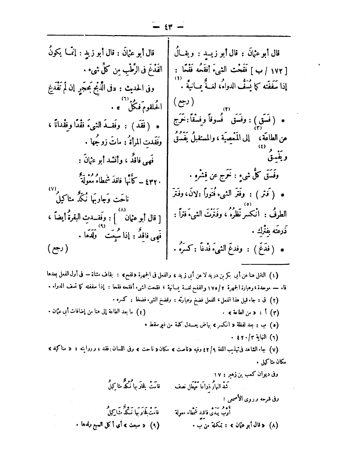 (¬1) النقل هنا عن أبى بكر بن دريد لا عن أبى زيد، والفعل فى الجمهرة «قفح»: بقاف مثناة - فى أول الفعل بعدها فاء - موحدة، وعبارة الجمهرة 2/ 175 والقفح لغة يمانية، فقحت الشئ أفقحه فقحا: إذا سففته كما تسف الدواء.