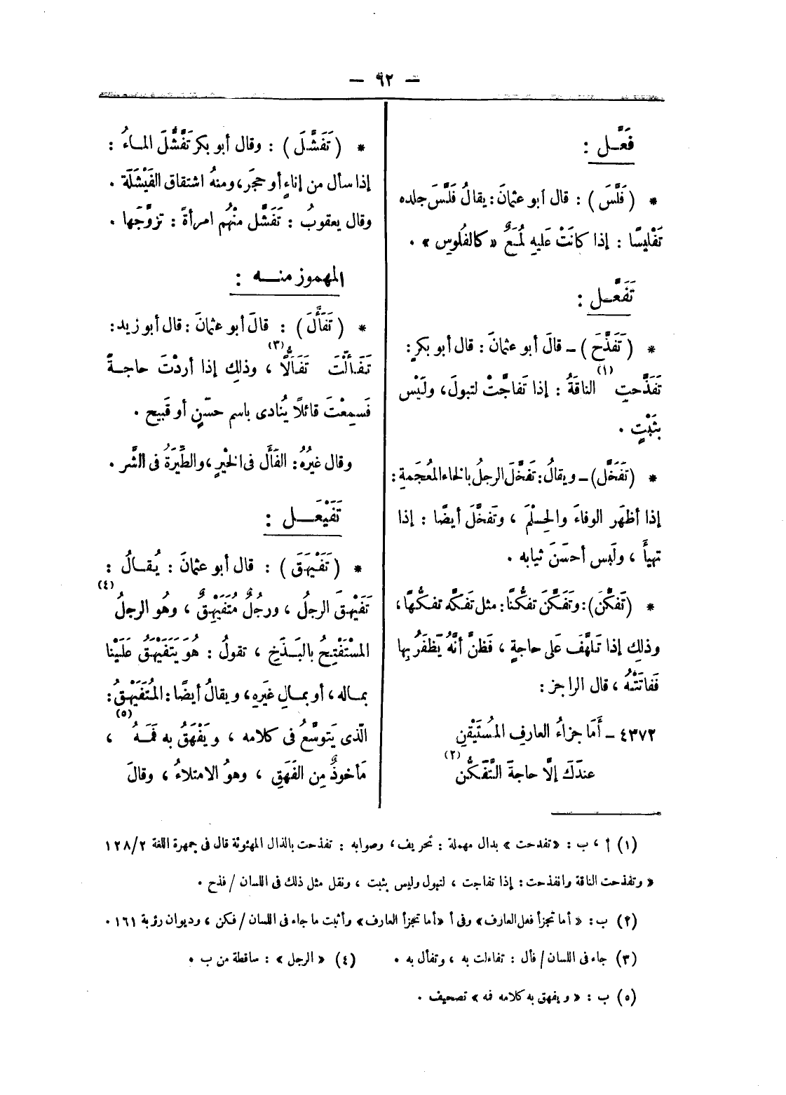 (¬1) أ، ب: «تفدحت» بدال مهملة: تحريف، وصوابه: تفذحت بالذال المهئوئة قال فى جمهرة اللغة 2/ 128 «وتفذحت الناقة وانفذحت: إذا تفاجت، لتبول وليس بثبت، ونقل مثل ذلك فى اللسان/ فذح.