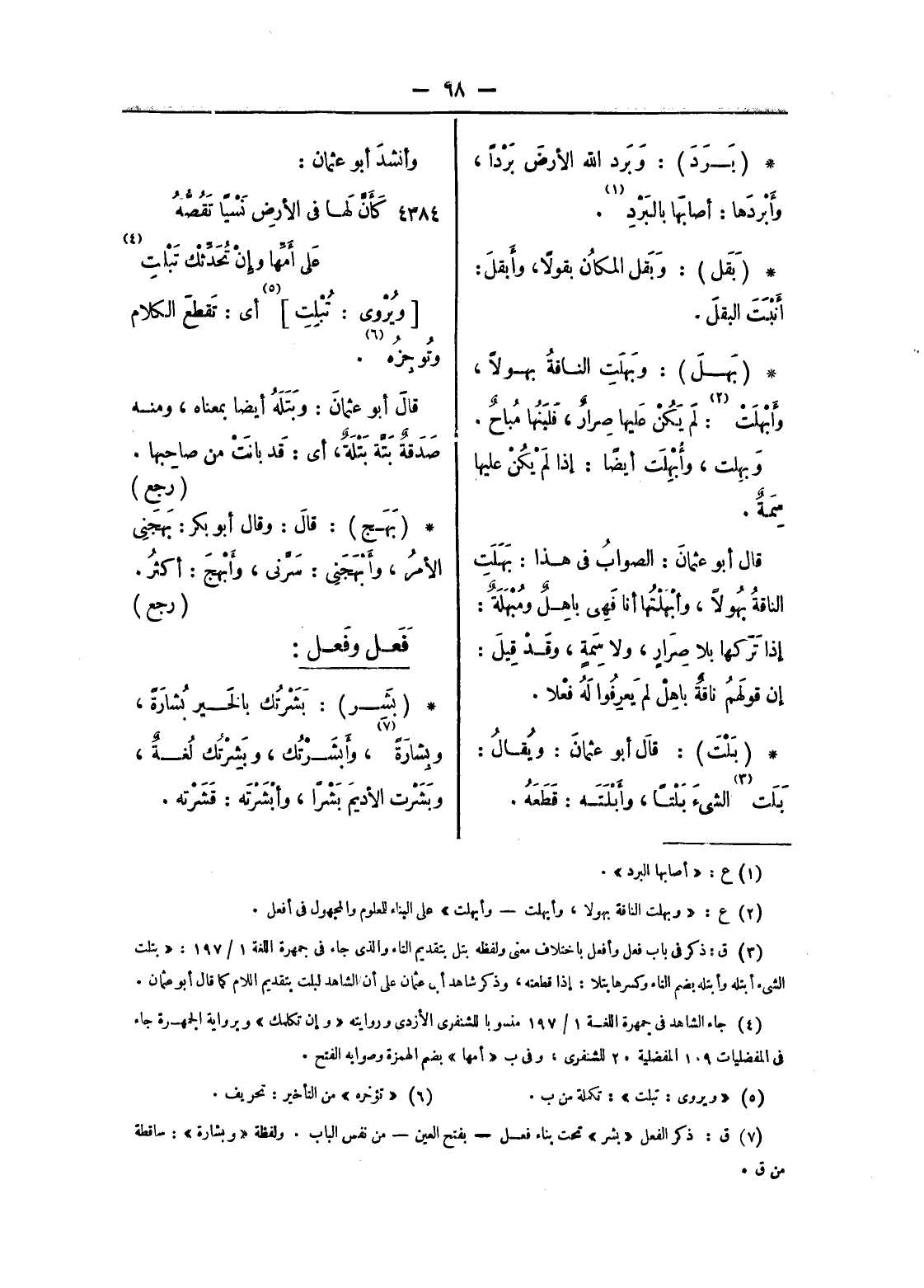 (¬3) ق: ذكر فى باب فعل وأفعل باختلاف معنى ولفظه بتل بتقديم التاء والذى جاء فى جمهرة اللغة 1/ 197: «بتلت الشئ أبتله وأبتله بضم التاء وكسرها بتلا: إذا قطعته، وذكر شاهد أبى عثمان على أن الشاهد لبلت بتقديم اللام كما قال أبو عثمان.