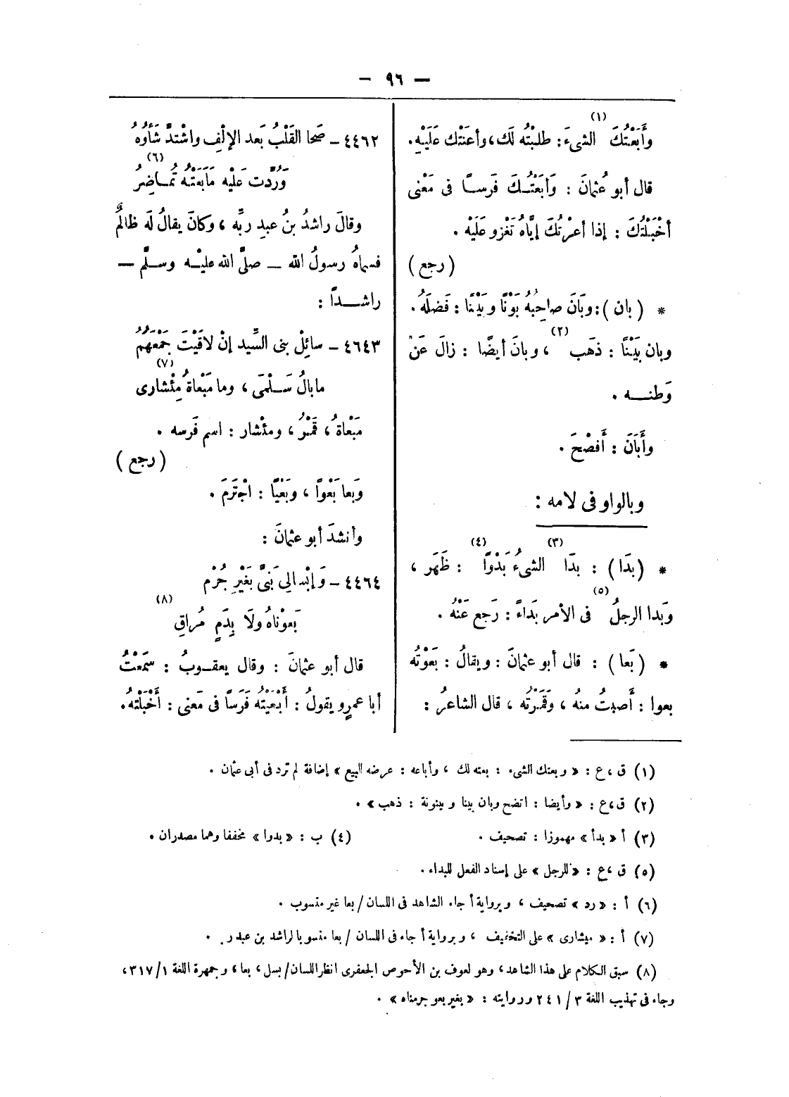 (¬8) سبق الكلام على هذا الشاهد، وهو لعوف بن الأحوص الجعفرى انظر اللسان/ بسل، بعا، وجمهرة اللغة 1/ 317، وجاء فى تهذيب اللغة 3/ 241 وروايته: «بغير بعو جرمناه».