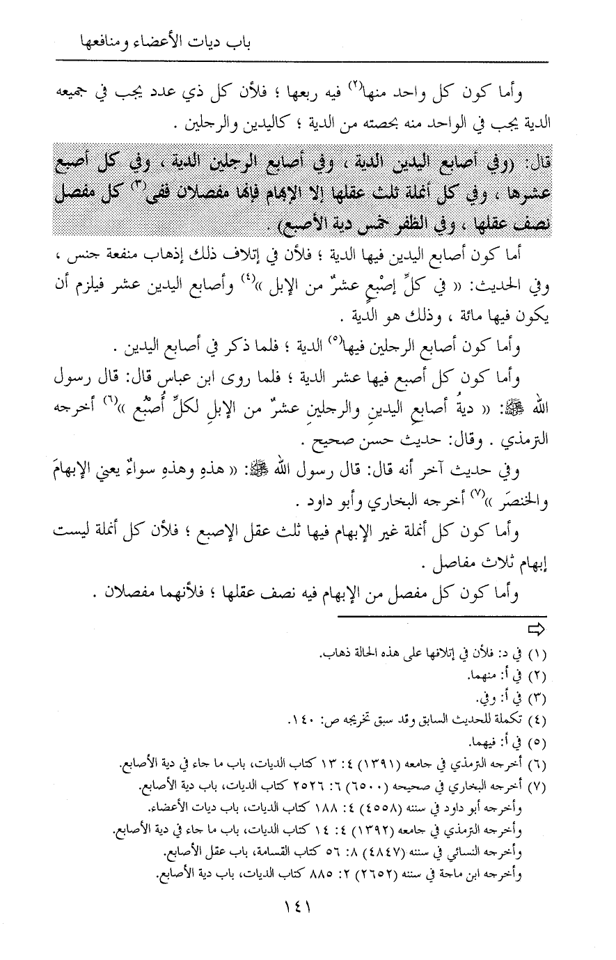 (¬5) أخرجه الترمذي في جامعه (1391) 4: 13 كتاب الديات، باب ما جاء في دية الأصابع.