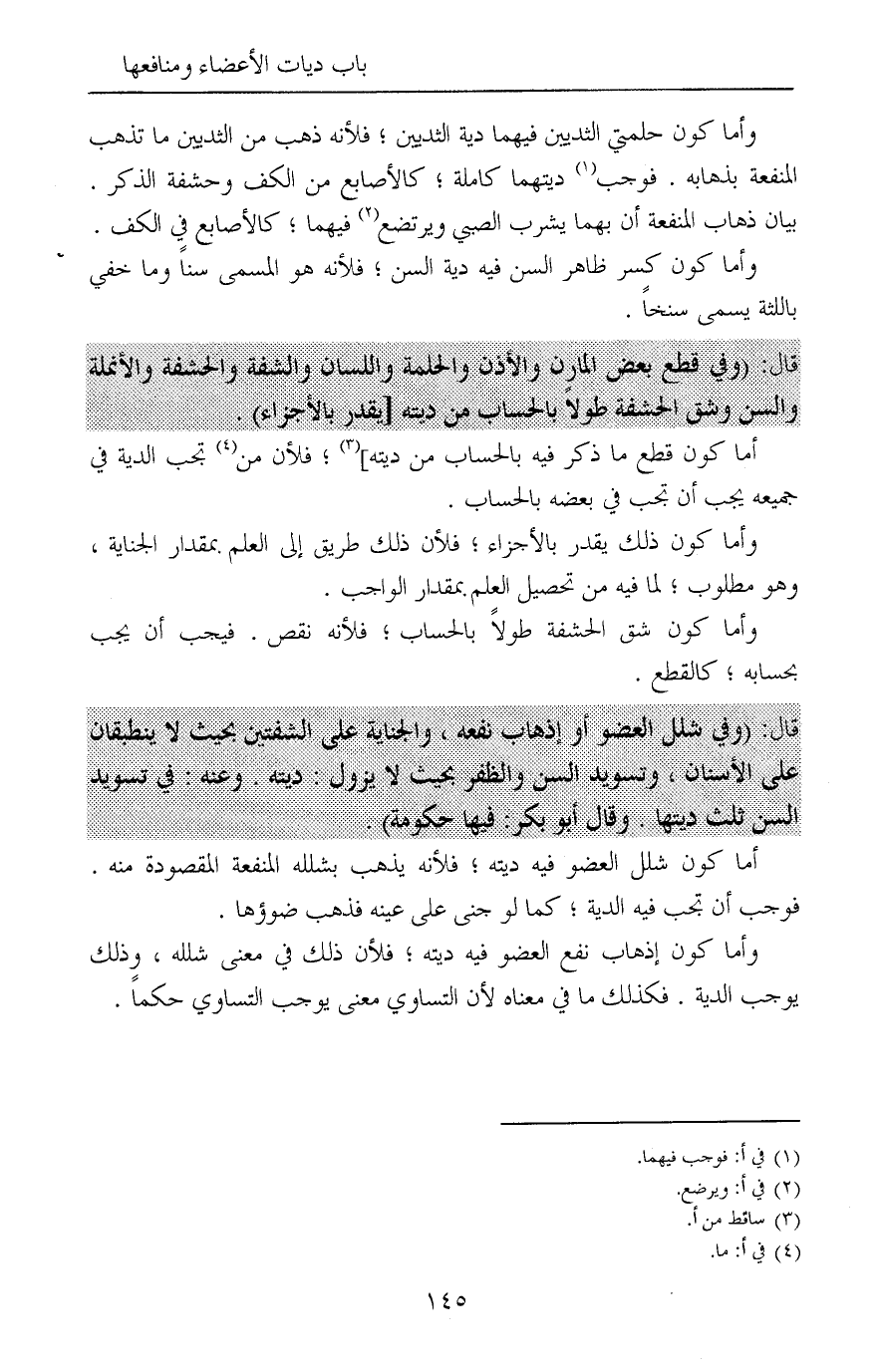 وأما كون إذهاب نفع العضو فيه ديته؛ فلأن ذلك في معنى شلله، وذلك يوجب الدية. فكذلك ما في معناه لأن التساوي معنى يوجب التساوي حكماً.