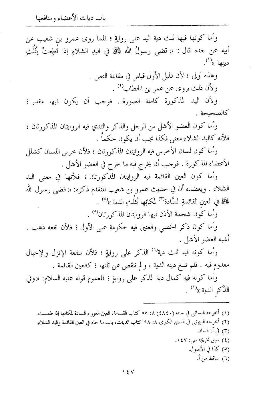 وأما كون العين القائمة فيه الروايتان المذكورتان؛ فلأنها في معنى اليد الشلاء. ويعضده أن في حديث عمرو بن شعيب المتقدم ذكره: «قضى رسول الله صلى الله عليه وسلم في العينِ القائمةِ السَّادة (¬3) لمكانِها بُثلُثِ الدية» (¬4).