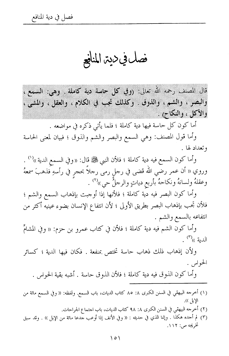 وأما كون البصر فيه دية كاملة؛ فلأنها إذا أوجبت بإذهاب السمع والشم؛ فلأن تجب بإذهاب البصر بطريق الأولى؛ لأن انتفاع الإنسان بضوء عينيه أكثر من انتفاعه بالسمع والشم.
